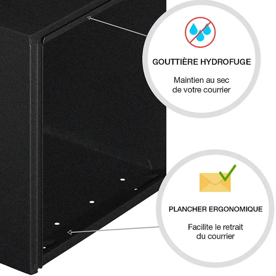 Produit sur-mesure : ce produit spécial est fabriqué à la commande. Boite aux lettres normalisée 1 porte Renz Préférence avec décor. Permet de recevoir jusqu’à 45% des colis du e-commerce. Boitier avec gouttière hydrofuge permettant de maintenir le courrier au sec. Porte recouvrante équipée d’un volet acier avec atténuation de bruit pour un meilleur confort acoustique et d’un porte-nom affleurant en polycarbonate. Serrure normalisée avec 2 clés. Plancher ergonomique pour un retrait facile du courrier. Peinture poudre polyester sans plomb. Garantie anti-corrosion de 15 ans. Anti-vandale grade 3, résistant jusqu’à 60 kg d’arrachement. Certifiée loi handicap. Dimensions : 285x285x385mmLa boite aux lettres Préférence bénéficie d’un design de porte simple qui s’harmonise parfaitement avec tout type d’extérieur. Pour protéger votre courrier des intempéries, elle est dotée d’une gouttière hydrofuge et d’une porte recouvrante équipée d’un volet en acier. Ce volet amorti réduit le bruit lors de son ouverture et de sa fermeture, pour un meilleur confort sonore. De plus, son plancher ergonomique facilite la récupération de votre courrier. Normalisée, Préférence permet de réceptionner son courrier et des petits & moyens colis.Photos non contractuelles, se référer au RAL pour le coloris.