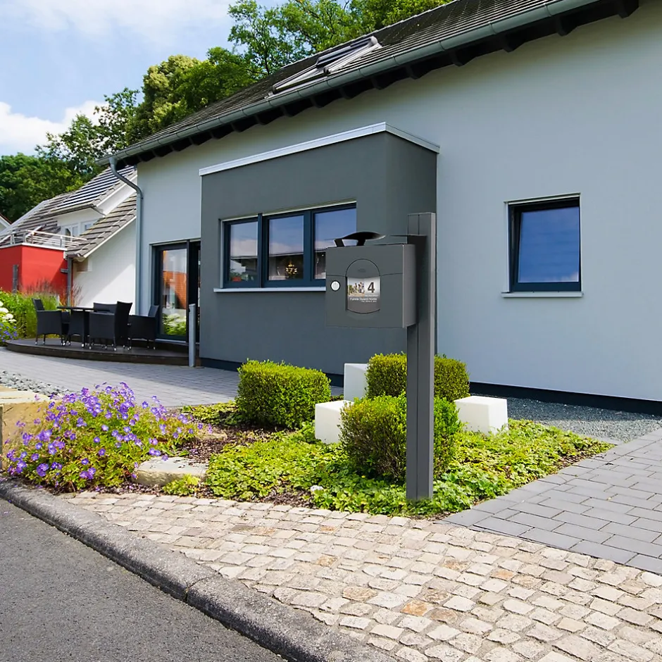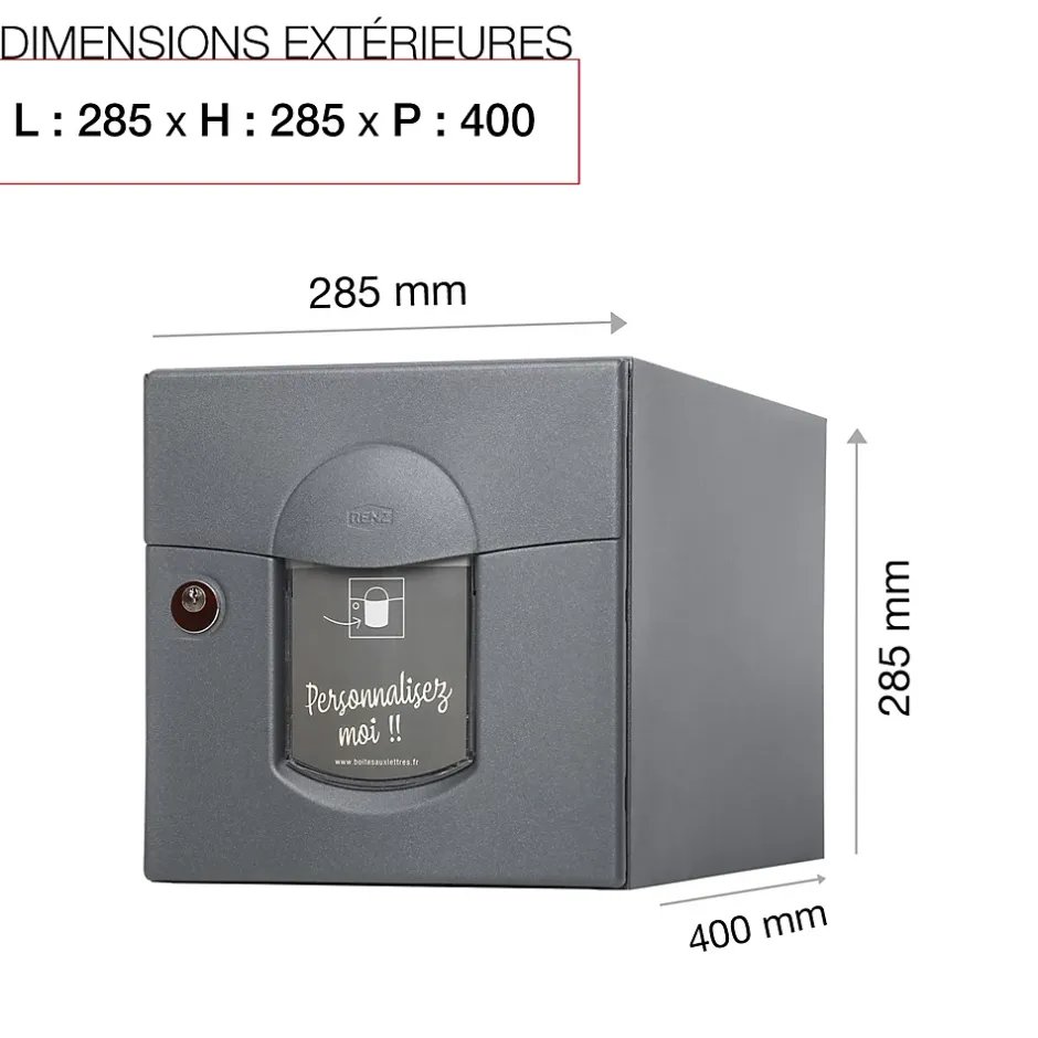 Boite aux lettres normalisé 2 portes Renz Soléa aux lignes courbes. Boitier avec gouttière hydrofuge. Porte avant galbée et recouvrante avec large volet recouvrant et grand porte-nom personnalisable sur le site de RENZ. Plancher ergonomique pour un retrait facile du courrier. Serrure agréée La Poste. Fond pré percé, facilitant la mise en place des accessoires de pose spécialement adaptés. Herse antivol renforcée. Peinture poudre polyester sans plomb. Garantie anti-corrosion de 15 ans. Anti-vandale grade 3, résistant jusqu’à 60kg d’arrachement. Certifiée loi handicap. Dimensions : 285x285x415mm. Boite aux lettres éco-conçue, tout a été étudié pour diminuer au maximum son empreinte sur l’environnement.La boite aux lettres Soléa 2 portes bénéficie d’un cycle de fabrication qui réduit au maximum son impact sur l’environnement. Avec une garantie anti-corrosion de 15 ans, elle offre une durabilité exceptionnelle. Soléa possède un design unique et original, grâce à une porte galbée et un large volet aux lignes courbes. Vous avez la possibilité de personnaliser l’étiquette de son large porte-nom. Son plancher ergonomique facilite la récupération de votre courrier. Elle est également équipée d’un fond pré-percé pour faciliter l’installation de votre boite. Sa capacité de réception permet de réceptionner du courrier, ainsi que des petits & moyens colis. À l’arrière, une seconde porte vous permet de récupérer votre courrier plus rapidement, directement dans votre propriété.Photos non contractuelles, se référer au RAL pour le coloris.
