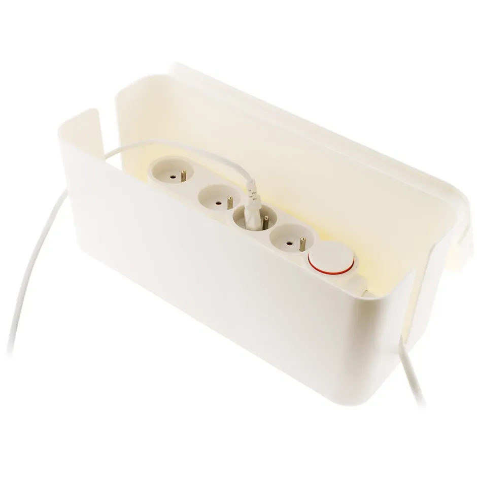Boîte cache multiprise. Couleur(s) : blanc. Discrète dissimulation des multiprises et câbles électriques. Facilite l’accès à la multiprise et aux câbles. Permet d’accueillir une multiprise standard et les excédents de câbles. Améliore l’esthétique et le rangement des branchements électriques. Sobre et moderne, s’intègre dans tous les environnements (bureau, salon, etc.). Limite l’encombrement visuel et évite l’accumulation de poussière sur les branchements