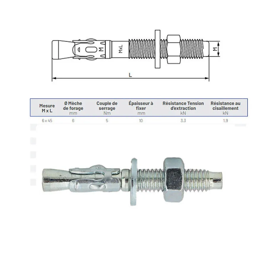 Matériaux et finitionL’arbre fileté et le clip sont en acier au carbone grade 4.8. La rondelle et l’écrou sont en acier. La finition est zinguée blanc.Dimensions et caractéristiquesMesure M x L : 6 x 45Diamètre de percage : 6 mmCouple de serrage : 5 NmEpaisseur à fixer : 10 mmRésistance tension d’extraction : 3,3 kNRésistance au cisaillement : 1,9 kNAvantagesFixation simple et rapideRésistance élevée à la traction et au cisaillement