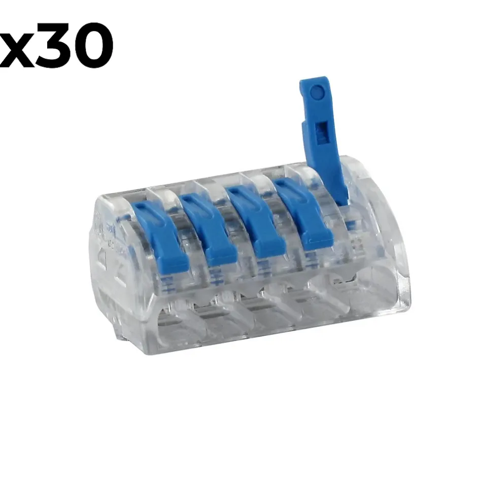 Caractéristiques de la borne à levier pour fil 0.2 mm² à 4mm² – WagoModèle : borne à levierSérie BLM 485Section des fils pris en charge : 0.2 mm² à 4 mm²Tension de référence : 450 VCourant nominal : 32 ALongueur de dénudage recommandée : 10 mmConçues avec des leviers qui permettent de verrouiller/déverrouiller chaque entréeEn boite de 30, 50 ou 70Avec 2/3/5 entréesLa borne à levier série BLM 485 est une solution idéale pour les installations électriques nécessitant des connexions sûres et pratiques.Elle prend en charge des fils de 0,2 mm² à 4 mm², offrant ainsi une grande polyvalence dans différents types de câblage. Grâce à sa capacité à supporter une tension de 450 V et un courant nominal de 32 A, cette borne garantit des performances fiables dans diverses applications.Avec une longueur de dénudage recommandée de 10 mm, elle assure une connexion optimale et sécurisée. Conçue avec des leviers pratiques permettant de verrouiller et déverrouiller facilement chaque entrée, cette borne facilite une installation rapide et sans erreur.Elle est disponible en boîtes de 30, 50 ou 70 unités, offrant ainsi des solutions adaptées à des projets de toutes tailles. Enfin, avec des configurations de 2, 3 ou 5 entrées, elle répond à divers besoins de câblage, ce qui en fait un choix parfait pour des travaux professionnels ou domestiques.