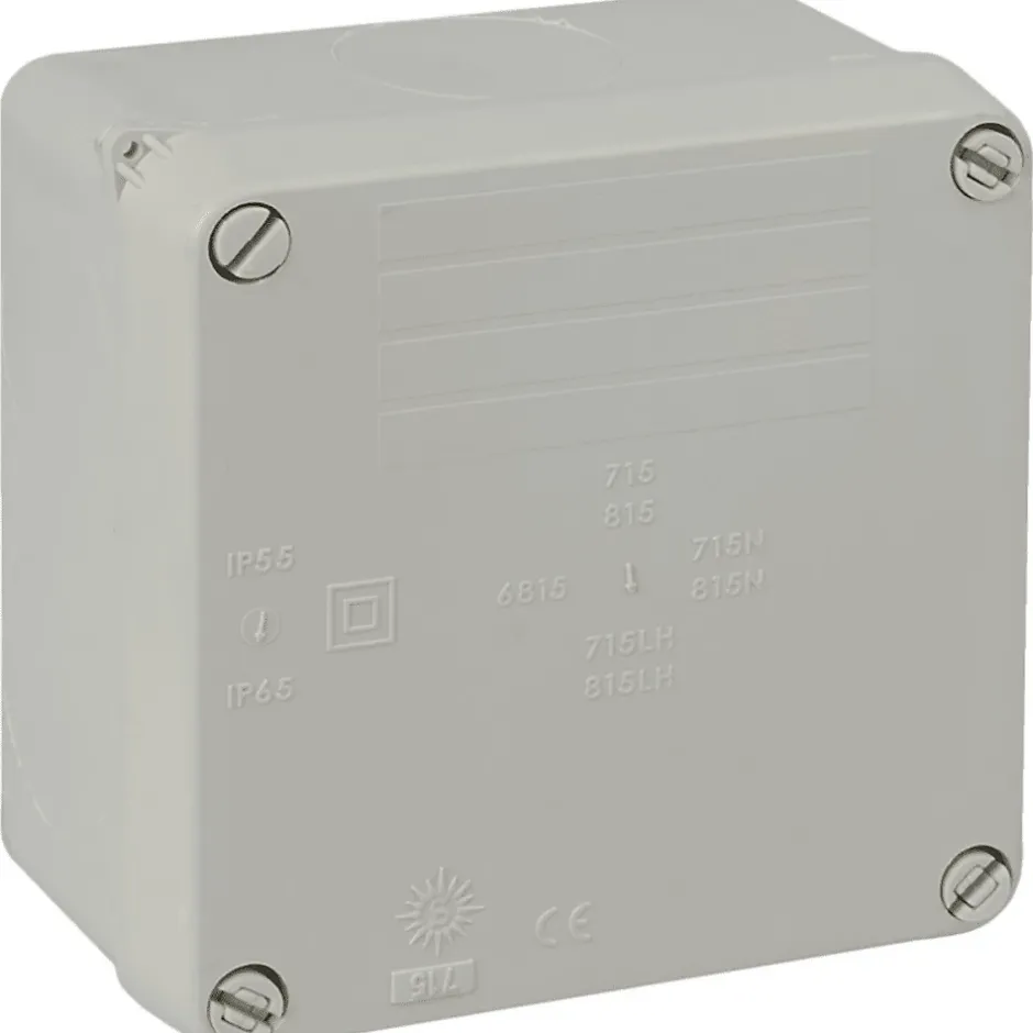 Boîte étanche de connexion : 100 x 100 x 55 mm. Couleur gris RAL 7035. Protection : IP65, IK08. Fermeture à vis 1/4 de tour. Scellable. Mode d’installation : en saillie. Sans cône. Forme carrée. Garantie 2 ans.