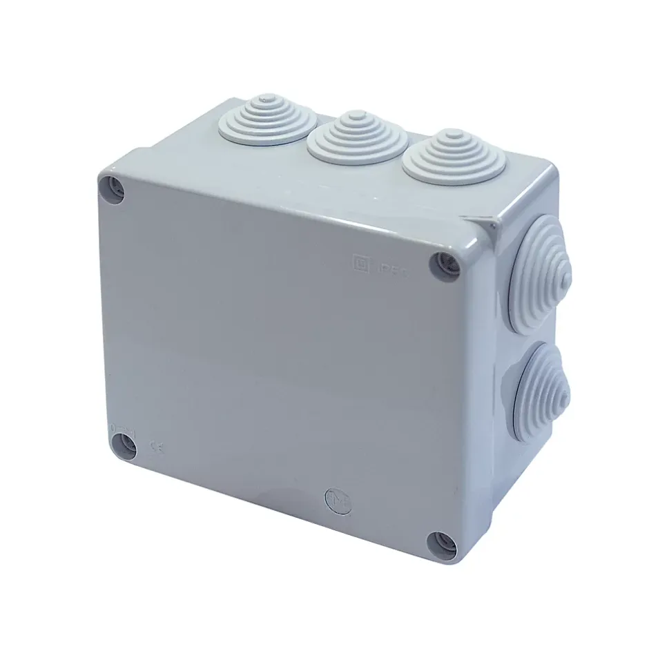 Boîte de dérivation extérieure avec 10 passe-câbles + vis et système de verrouillage intégré.