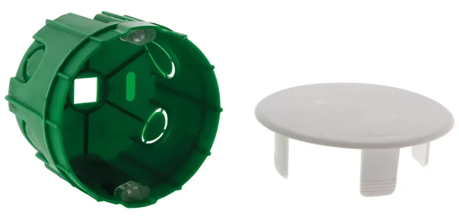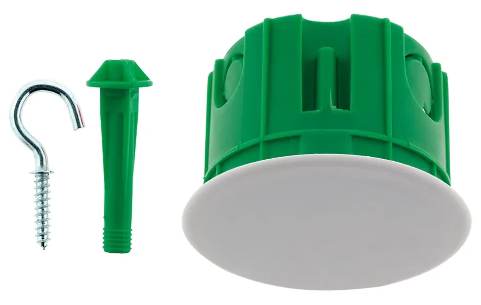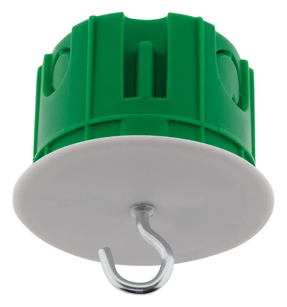Boite point de centre murs pleins. Avec crochets de suspension inclus. Pour installation luminaire au plafond. Livrée avec crochet. Charge maximale 25kg. Haute résistance au feu 850°. Diamètre : Ø65mm. Profondeur 50mm. Dimensions extérieures Ø67mm. Diamètre de perçage Ø67mm