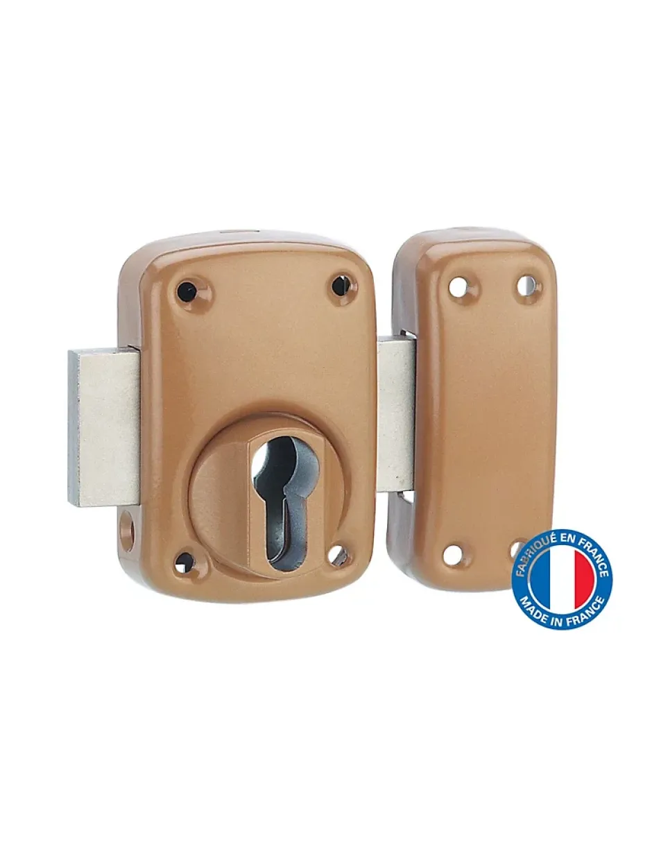Boitier de verrou pour cylindre profilé. Livré sans cylindre. Coffre et gâche acier embouti. Pêne acier chromé mat. Pour porte d’entrée. Finition epoxy or.