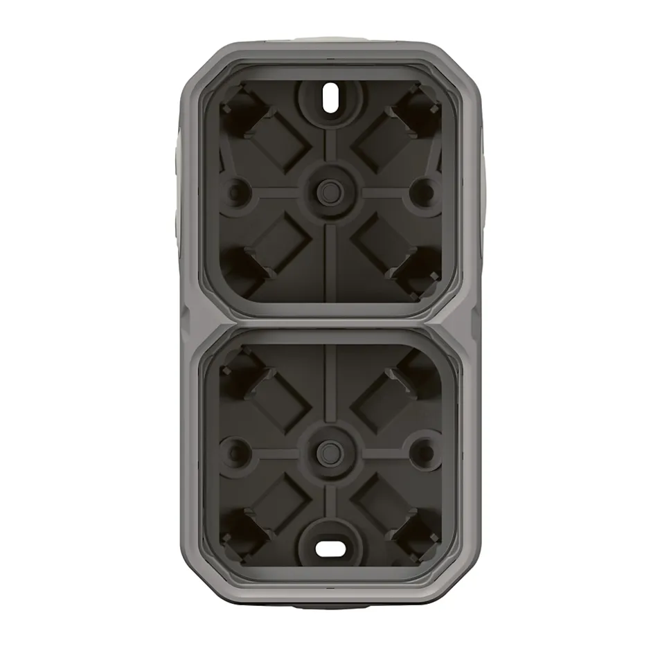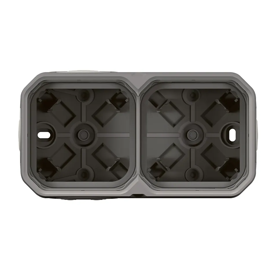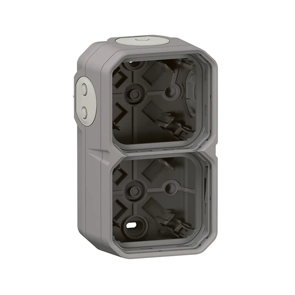 - Boîtier saillie étanche Plexo 2 postes, conçu pour montage horizontal ou vertical sans cloison.