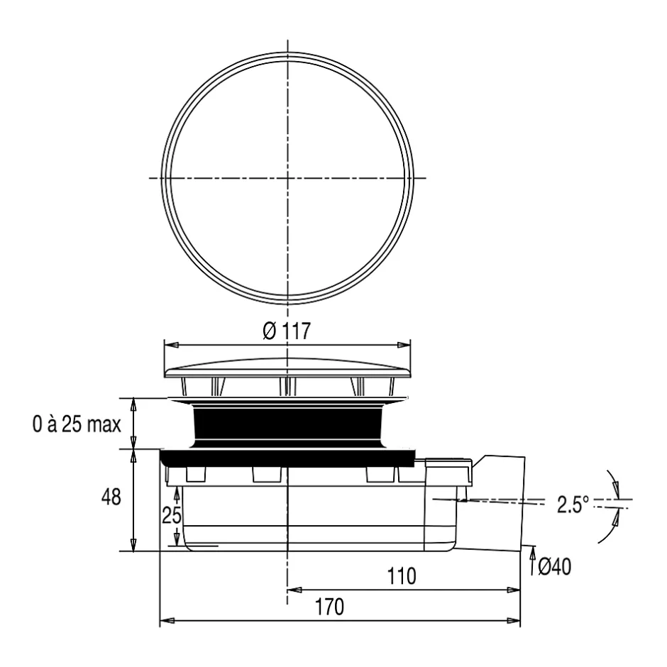 - • La sortie horizontale d’un diamètre de 40 mm offre une pente intégrée de 2,5°.