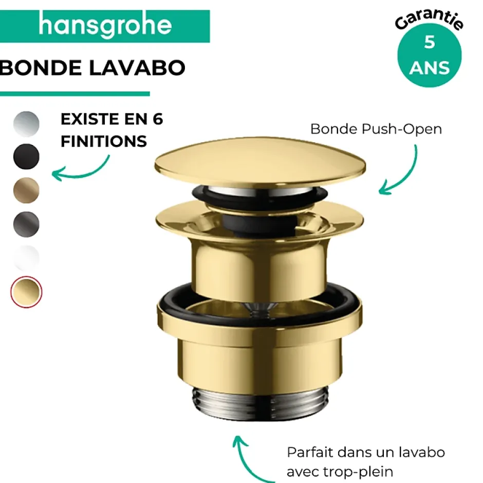 Les caractéristiques de la bonde Push Open HANSGROHE Aspect doré poliGarantie 5 ans HANSGROHEiF product design award 2019 : label international qui récompense les produits les mieux conçus au monde.Note ECAU : E6, C0, A., U3Ouverture par bouchon pressionProduit pensé pour lavabos avec trop-pleinDimension du raccordement: G 1 ¼ »Bonde avec trop-pleinPour plus d’informations retrouvez la fiche technique du produit