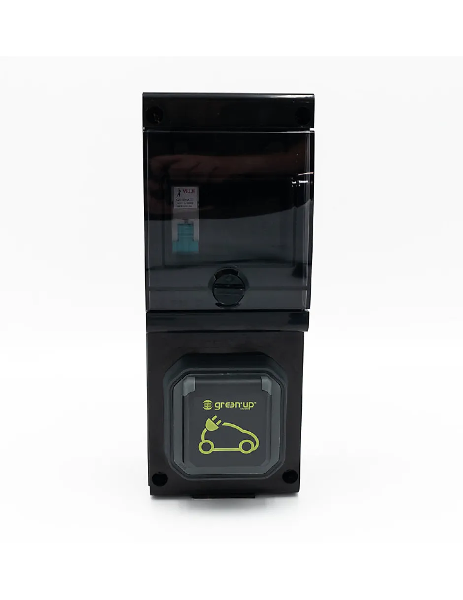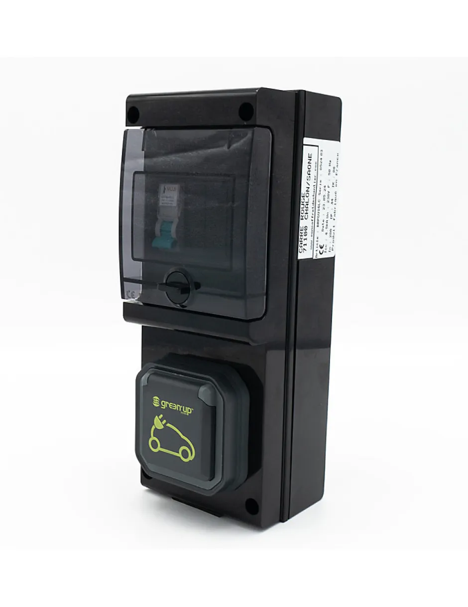 -enveloppe ABS 110x280x95 IP44 IK 08-4 modules-1 disjoncteur différentiel P/N 20A 30mA Type A- 6kA-C-1 prise Green’Up Legrand-contacts argentés permettant une charge rapide-un aimant situé sous la prise permet à celle-ci d’être détectée par le câble de recharge, et ainside monter l’ampérage de charge jusqu’à 14A quand on connecte la prise male Legrand Green’up-IP66 et IK08: adapté pour l’extérieur -1 bornier de terre-1 presse étoupe PG13.5 non montéProtection IMO CorpRaccordement à partir du tableau par une ligne dédiée, avec câble de 3 x 2,5 mm² minimum – 18817 . : Borne de recharge véhicule électrique, . Borne complète ‘prêt à brancher » pour la recharge de votre véhicule électrique .Equipée d’une prise Green’Up Legrand et toutes les protections nécessaires Mode 1 ou 2