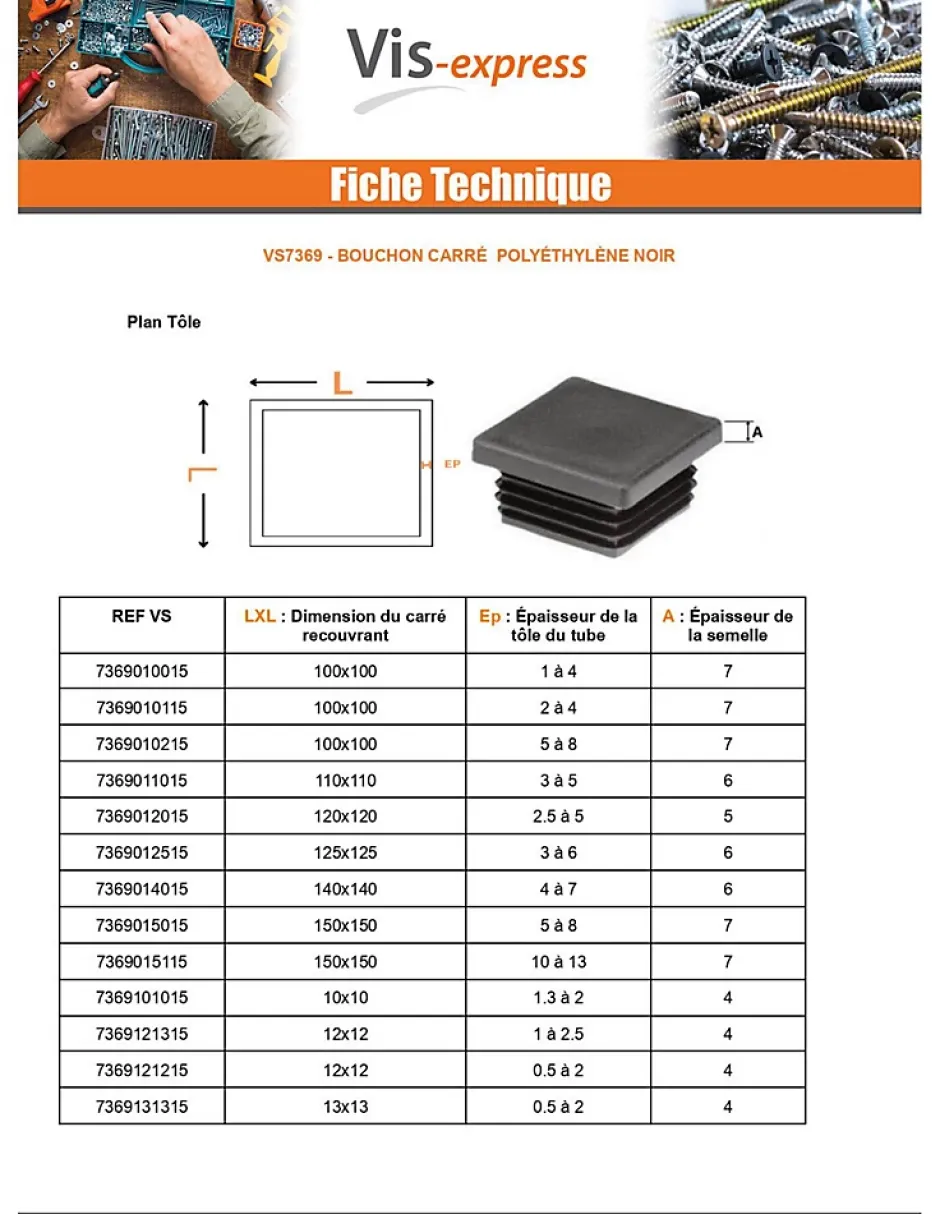 Bouchon carré 50X50 épaisseur tole du tube 3 à 5 Polyethylène noirMatiere = PolyethyleneAutre références : 3617501802674 2204-071 3663072056190