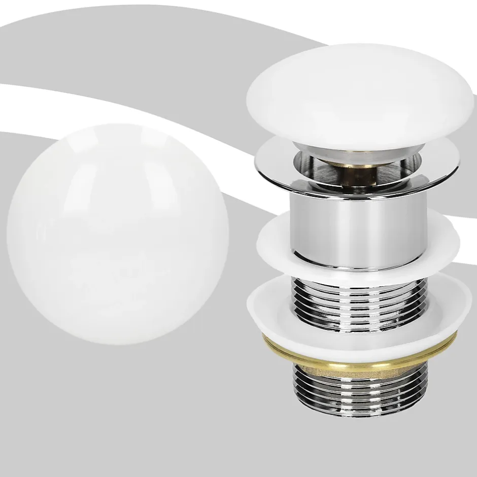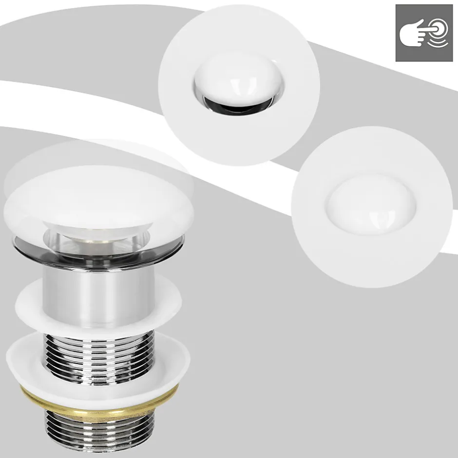 Description du produit:Vous pouvez ouvrir et fermer le robinet de vidange LuxeBath d'une simple pression du doigt sur le couvercle. Cette technologie dite Push-Open a été développée pour pouvoir comprimer le lavabo le plus rapidement et le plus facilement possible. Le système de vidage s'installe facilement dans n'importe quel lavabo et est prêt à l'emploi. La taille unique vous permet de combiner facilement la bonde avec le lavabo de votre choix. Le bouchon se dévisse facilement, ce qui facilite le nettoyage.Une installation facile.1. placez la rondelle supérieure sur le trou d'évacuation de l'évier.2. placez le corps principal dans l'évier.3. placez la rondelle inférieure sur la partie filetée.4. serrez la pièce de verrouillage.Remarque: Convient aux lavabos sans trop-plein !Caractéristiques:Installation sans outilConvient universellement à presque tous les lavabosCéramique de haute qualité et acier inoxydable de haute qualitéGarniture de vidage pour lavabos sans trop-pleinTechnologie Push-Open pour une utilisation confortableLivraison:1 x Garniture de vidage pour lavabos sans trop-pleinInformation technique:Couleur : blanc, matPoids : environ 0,25 kgMatériau : céramique, acier inoxydableDiamètre de la tête en céramique : environ 70 mmDiamètre de l'écoulement : dimension d'installation standard 1 1/4 pouce (41,2 mm) mâleHauteur : environ 109 mmRemarque: Le couvercle en céramique blanche peut varier de quelques millimètres, c'est une particularité de la fabrication de la céramique causée par l'humidité et la température du four. Néanmoins, cette variation de taille n'affecte pas la fonctionnalité ou le fonctionnement de la bonde.