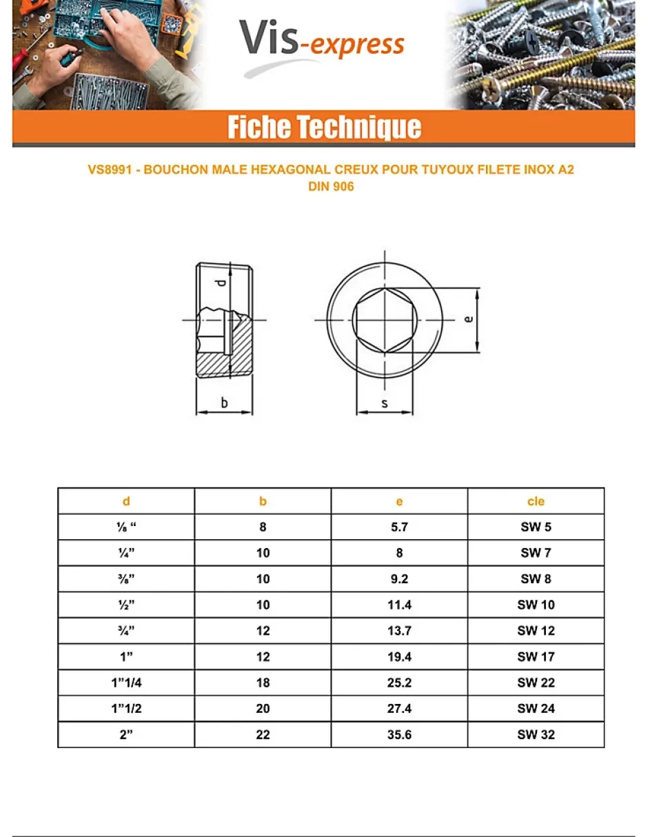 Bouchon mâle hexagonal creux à visser SW12 3/4 12X13.7 Inox A2 Autre références : 0906234
