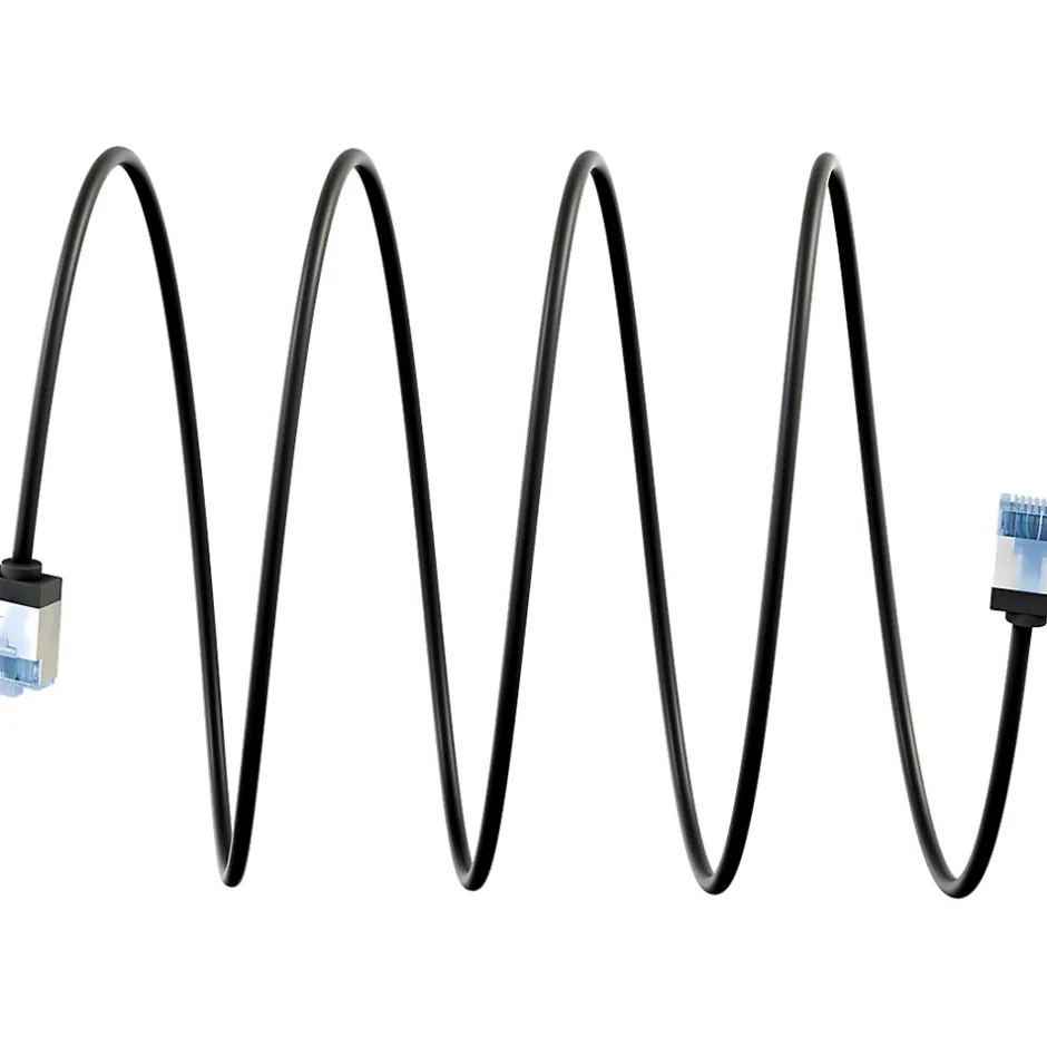 Câble Ethernet Cat 6a U/FTP LSOH slim / ultra flexible – noir 15mLes câbles réseaux superslim blindés avec connecteurs extracourts réduisent drastiquement le volume de matériel dans les coffrets / baies informatique,les panneaux de brassage ou derrière un élément proche du mur – pour une circulation de l’air nettement améliorée et une accumulation de chaleur moins importante qu’avec un câblage traditionnel. De plus, la gaine en TPE souple et les conducteurs en cuivre minces assurent une flexibilité et une efficacité matérielle particulières qui font de cette génération de câbles le partenaire réseau parfait. Flexible à coup sûr : Blindé et à paires torsadées et avec une gaine en TPE sans halogène et à faible dégagement de fumée pour un rayon de courbure particulièrement petit et une grande flexibilité Grâce à l’AWG 32 et à un diamètre extérieur de 3,8 mm, le câble est ultra-mince, mais aussi performant qu’un câble CAT standard Le câble réseau haute vitesse est parfait pour les réseaux Ethernet 10 Gigabit, rétrocompatible avec les anciennes générations en 100 Mbps ou 1000 Mbps (Gigabit). Le câble RJ45 convient pour Power over Ethernet (PoE, PoE+, UPoE, 4PPoE) et HDBaseT La protection anti-pliage efficace et compacte est forte contre la rupture de câble et assure une longue durée de vie du câble Ethernet