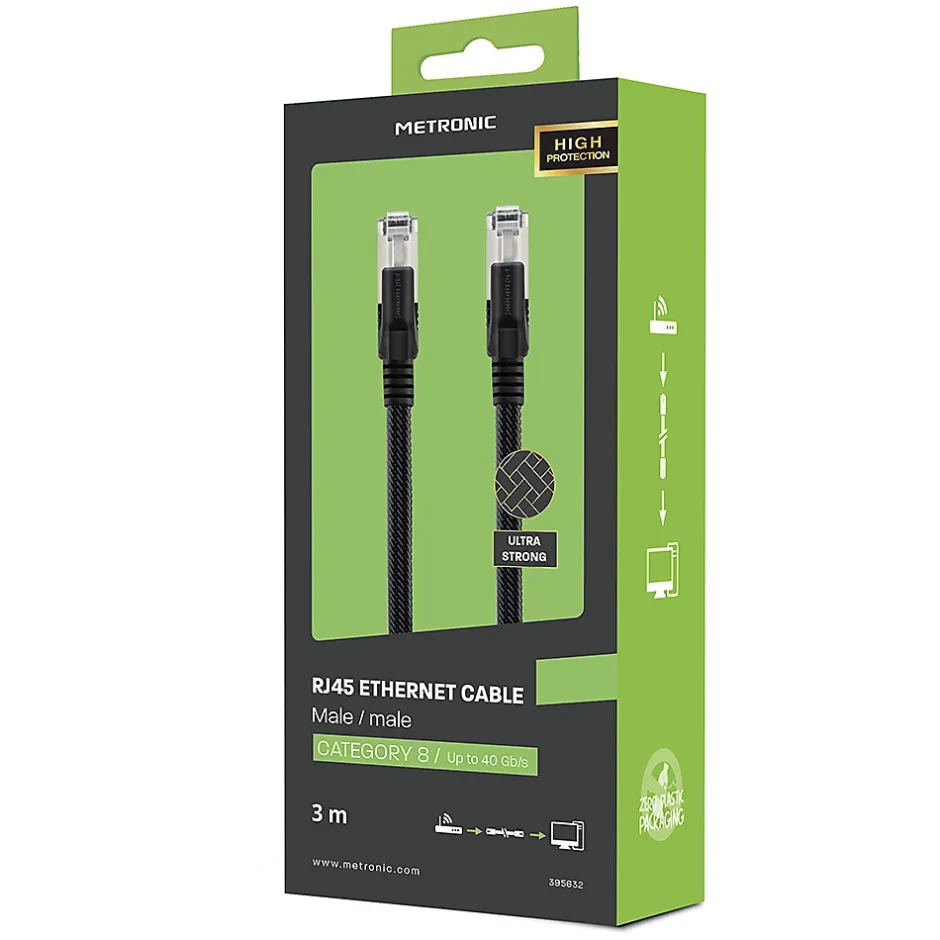 Points forts40 Gb/sTriple blindageGaine nylon tresséDescriptionPermet de connecter à internet un ordinateur, une télévision ou une console de jeux de dernière génération.Ce câble permet de relier tout appareil équipé d’une entrée RJ45 à une box internet ou TV, un routeur, un switch, une prise réseau ou CPL équipés d’une sortie Ethernet RJ45.Le câble RJ45 CAT 8 offre une vitesse de transmission des données jusqu’à 40 Gb/s soit 4 fois plus rapide qu’avec un câble RJ45 CAT 6A. Il offre une expérience d’Internet plus fluide et plus rapide,Transmission des données sans interférences grâce au blindage S/FTP avec des contacts dorés pour une connectivité supérieure.Sa gaine tressée assure une résistance au pliage et aux manipulations liées aux branchements répétitifs.Caractéristiques techniques8 contacts dorésVitesse de transmission jusqu’à 40 Gb/sBlindage S/FTPRétrocompatible avec câble RJ45 CAT 7Longueur : 3 m