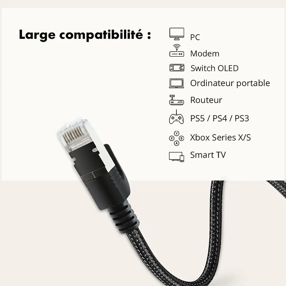 - Ce câble permet de relier tout appareil équipé d’une entrée RJ45 à une box internet ou TV, un routeur, un switch, une prise réseau ou CPL équipés d’une sortie Ethernet RJ45.