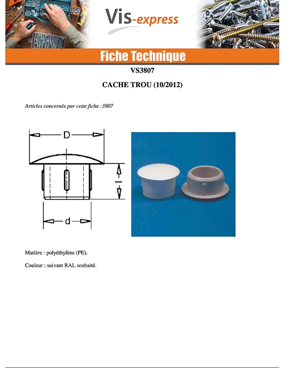 Cache Trou 12/5.5 Longueur 5.6 Aluminium RAL9006 aluminium blancDiametre = 12, Longueur = 5.5, Matiere = Aluminium, Famille De Produits = Cache VisAutre références : 3617500144362 KH00501 KH00501 KH00501 KH00501 3663072065703