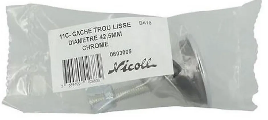 – Cache trou chromé pour évier et lava bo- Matière: zamac- Coloris: chromé- Finition: brillant- Aspect: lisse- Forme: ronde- Laiton avec joint d’étanchéité – Cache trou lisse chromé pour évier et lavabo- Permet de recouvrir les perçages d’anciennes robinetterie – Léger et robuste- Design simple et épuré- Reconnu pour sa robustesse, le cache trou lisse chromé Nicoll est idéal pour recouvrir les perçages d’anciennes robinetteries- Diamètre de recouvrement : 9 à 38 mm- Epaisseur de serrage : 0 à 45 mm- Facile à installer Dimensions et Poids: – Diamètre : 42 mm- Poids: 0,06 kg Autres données : – Diamètre du cache : ø42,5 mm- Diamètre de recouvrement : ø9 à ø38 mm- Épaisseur de serrage : 0 à 45 mm Garantie: 1 an contre vices de fabrication, hors pièces d’usure