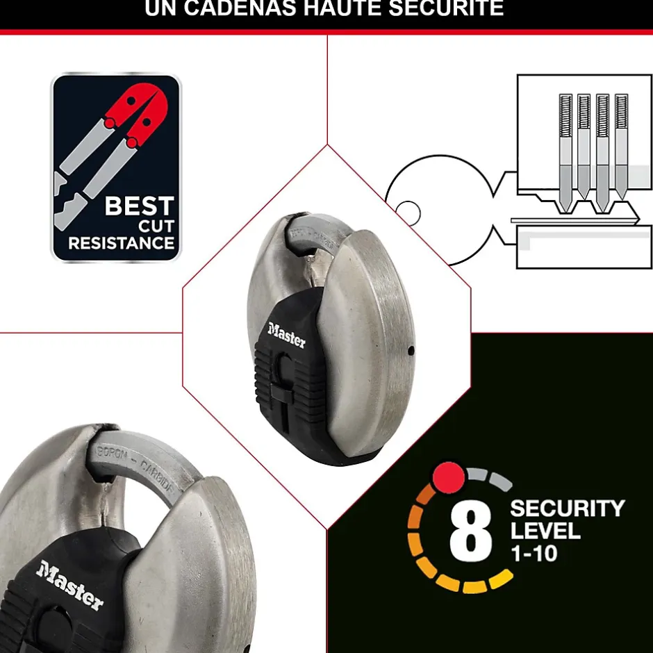 Le cadenas Excell® disque Master Lock n° 40EURT comprend un corps en acier inoxydable de 70 mm de large pour plus de robustesse, fiabilité et résistance à la corrosion. Le cadenas est entièrement protégé, ce qui évite l’exposition de l’anse et protège des attaques au coupe-boulon. L’anse octogonale de 10 mm de diamètre et 16 mm de haut se compose d’alliage de bore traité au carbure de tungstène Tough-Cut™, 50 % plus résistant que l’acier cémenté, offrant une résistance maximale à la coupe et au sciage. Le cylindre à 4 goupilles offre plus de résistance au crochetage et le double verrouillage à billes offre une résistance maximale contre l’effet de levier et le martelage. Le capuchon protecteur de serrure assure une meilleure protection contre les intempéries et la bande de protection renforcée une meilleure protection contre les éraflures. Ce cadenas est parfaitement adapté pour une utilisation en extérieur, il peut être utilisé pour des espaces de rangement, des remises, des garages, des remorques … La garantie à vie limitée vous garantit une tranquillité d’esprit grâce à une marque sur laquelle vous pouvez compter.
