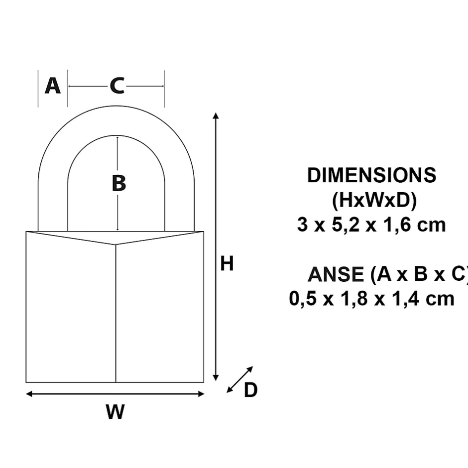 - CARACTÉRISTIQUES : (HxLxP) 3 x 5,2 x 1,6 cm ; anse (A x B x C) 0,5 x 1,8 x 1,4 cm ; 2 clés incluses