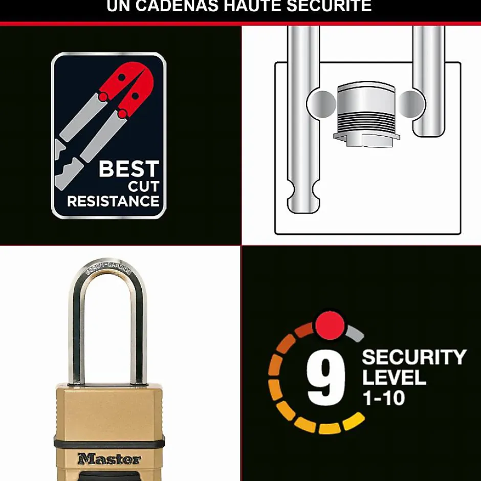 Le cadenas Excell Master Lock M175EURDLH associe un corps en zinc de 56 mm et une anse Tough-Cut™ en alliage de bore traitée au carbure de tungstène pour offrir une excellente résistance à la coupe et au sciage. Son verrouillage à billes renforce la protection contre le levier et le crochetage, tandis que le capuchon de molettes à charnière et le joint d’étanchéité protègent des intempéries. La combinaison programmable se réinitialise sans outil, rendant l’utilisation flexible et sécurisée, et la garantie à vie limitée assure une fiabilité durable.
