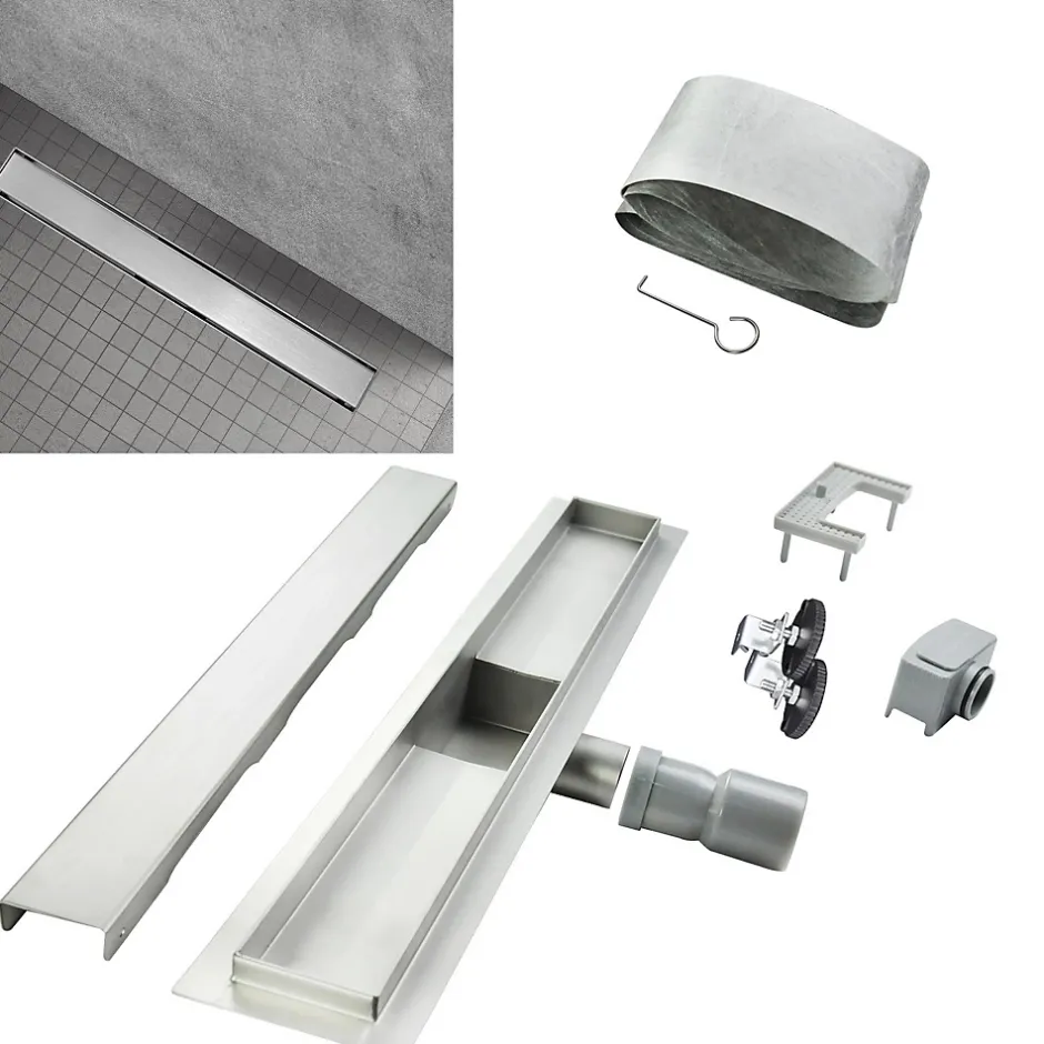 DALA CANIVEAU DE DOUCHE ITALIENNE INOX L.70 CM AVEC SIPHON ANTI-ODEURS + FILTRE, DRAINAGE PERFORMANT – Existe en différentes longueurs (de 50 à 120 cm), et en différents motifs. Doté d’un panneau de drainage amovible en acier inoxydable, le caniveau de douche à encastré DALA est à la fois élégant et fonctionnel. Il dispose d’un système de drainage performant (jusqu’à 36 L/min), d’un siphon anti-odeur et d’un filtre à cheveux. Il est livré avec une membrane d’étanchéité et des pieds d’ancrage réglables en hauteur. De conception robuste, le caniveau DALA est fait pour durer. CARACTÉRISTIQUES : Composition : acier inoxydable – Installation : à encastrer au sol – Hauteur minimale d’installation : 68 mm – Longueurs au choix (cm) : 50, 60, 70, 80, 90, 100, 110, 120 – Panneau de drainage amovible (pour nettoyer le caniveau) – Capacité de drainage élevée jusqu’à 36 L/min – Siphon anti-odeur intégré – Filtre à cheveux et résidus inclus – 2 pieds d’ancrage réglables en hauteur (de 68 à 80 mm) – Raccordement : DIN pour le drain 40/50 (adaptateur DN40 → DN50) – Crochet fourni pour retirer le panneau amovible – 1 membrane d’étanchéité incluse – Poids : de 2,1 à 4,2 kg selon la dimension Instructions de montage détaillées incluses – Garantie : 2 ans INFOS LIVRAISON – Pas de livraison sur les îles. Livraison suivie (email et SMS) 1 colis. A réception, vérifiez en détail l’état de la marchandise (déballez les cartons) en présence du livreur. En cas d’incident, refusez le ou les colis abimés (prenez des photos) et inscrivez le motif précis sur le bon de livraison, puis contactez-nous immédiatement.