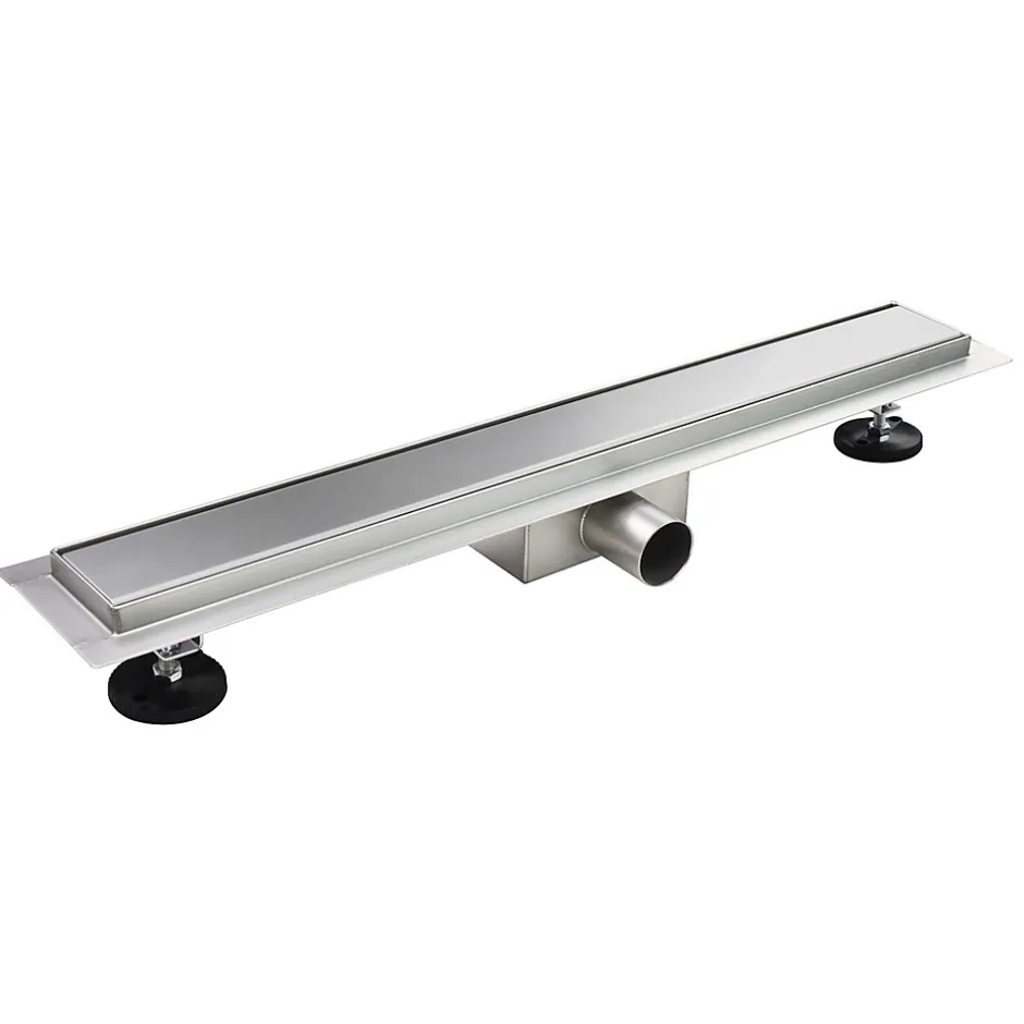 Caniveau de douche à encastrer en inox offrant un drainage élevé (jusqu’à 36L/min), un siphon anti-odeurs et 2 pieds d’ancrage réglables en hauteur.