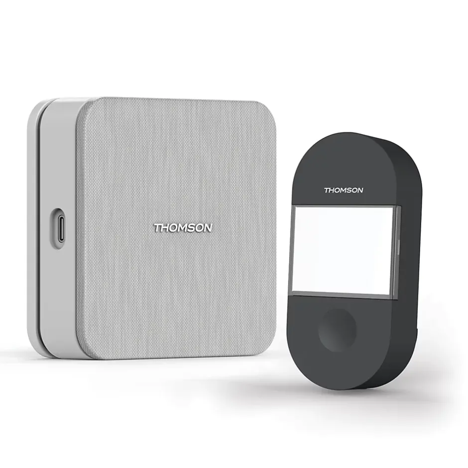 Optez pour la technologie kinéticAvec la technologie Kinétic, le bouton d’appel fonctionne grâce à l’énergie mécanique de l’appui qui crée une énergie éléctrique suffisante déclanchant la sonnerie du carillon. Plus économe et plus facile à installer, acceuillez vos visiteurs avec le nouveau carillon Thomson ! Une mise en place rapide et simpleLe bouton d’appel se fixe à l’extérieur de votre domicile avec une distance pouvant aller jusqu’à 150 mètres, en champ libre, entre le bouton et le carillon.Grâce à sa batterie rechargeable, le carillon se pose ou se fixe chez vous. Son design moderne et sobre s’adapte parfaitement à votre intérieur.Un mode d’accueil personnalisableCe carillon Thomson vous laisse le choix entre 7 sonneries d’accueil pouvant sonner à 5 niveaux sonores différents pour une alerte agréable au quotidien.Avec son flash LED lumineux disponible en 6 couleurs, optez pour celle de votre choix afin d’être en harmonie avec votre intérieur.Les autres fonctionnalités confortablesProgrammez le mode nuit en coupant le son de votre carillon, pratique pour s’épargner un réveil en pleine nuit ! Lorsque ce mode nocturne est activé, le son est éteint pour une durée de 3, 6 ou 9 heures. Cette solution d’accueil est évolutive de part les ajouts de 3 carillons et 3 boutons poussoirs supplémentaires pour en avoir 4 de chaque au total.Rechargez votre carillon avec un câble USB-C (non fourni)Le contenu du kitCe kit comprend :1 carillon sur batterie rechargeable par USB-C1 bouton d’appel kinéticLa visserie<p style= »text-align:ju