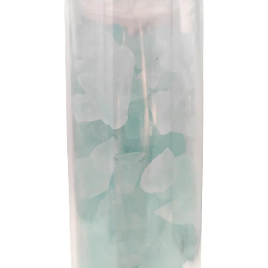 - Corps plastique transparent contenant des billes cristallines vertes visibles.