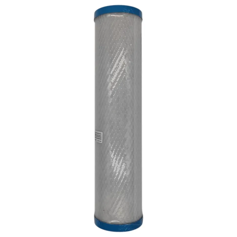 Cartouche charbon actif 20BB Chlorplus – 1µmLa cartouche ChlorPlus de 20 pouces Big Blue est conçue pour la déchloramination, déchloration et réduction des pesticides présents dans l’eau, particulièrement adaptée aux consommations d’eau importantes. Fabriquée en charbon de bois extrudé avec une finesse de filtration nominale d’1 micron, elle offre une solution fiable pour les systèmes nécessitant une réduction significative des chloramines, du chlore et poesticides dans l’eau de réseau. Caractéristiques de la cartouche charbon actif :S’intégrant parfaitement dans les carters Big Blue avec des entrées allant jusqu’à 1-1/2 pouce (40/49), cette cartouche contribue à réduire non seulement les sédiments mais également les fines particules présentes dans divers filtres granulaires. Pour maximiser sa durée de vie, il est conseillé d’utiliser une pré-filtration à 5 microns. Elle se distingue par sa capacité à traiter jusqu’à 1,9 million de litres pour le goût et l’odeur du chlore, ainsi qu’une réduction des chloramines sur environ 26 500 litres.Température d’utilisation : 5-51.7ºCMédia : charbon actif en poudre extrudé: charbon de boisEmbouts : polypropylèneEnveloppe intérieure / extérieure : polyoléfineFilet de protection : polyéthylèneJoints : Santoprène Applications de la cartouche charbon actif :Cette cartouche filtrante 20BB est adaptée à divers usages domestiques et industriels, stérilisation et dialyse pour le traitement de l’eau potable. Ses applications incluent également les systèmes d’osmose inverse et le secteur agro-alimentaire. La cartouche affiche une finesse nominale de filtration d’un micron, garantissant une efficacité nominale de 85% sous un débit spécifique.