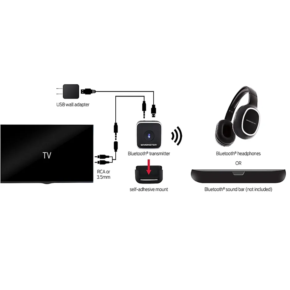 Découvrez le KIT casque TV + émetteur Bluetooth Monster, parfait complément de votre système de divertissement domestique. Ce casque TV sans fil numérique vous offre une qualité sonore exceptionnelle et vous libère des câbles. Sa conception supra-auriculaire fermée et ergonomique réduit le bruit de fond tout en offrant un maintien extraordinairement confortable. Vous serez plongé dans le son de votre musique, de vos émissions de télévision ou de vos films préférés sans déranger personne d’autre dans la pièce ! Diffusez facilement le son des téléviseurs et des consoles de jeu vers des écouteurs Bluetooth, une barre de son ou des haut-parleurs jusqu’à 10 mêtres de distance. Emetteur Bluetooth avec accroche murale. Casque Bluetooth à isolation acoustique passive offrant un son stéréo clair. Alimentation à partir du port USB de votre téléviseur HD ou avec l’adaptateur mural USB inclus. Installation rapide et configuration facile. Comprend: adaptateur mural USB, câble micro USB, câble audio 3,5 mm, adaptateur RCA vers 3,5 mm, casque Bluetooth.