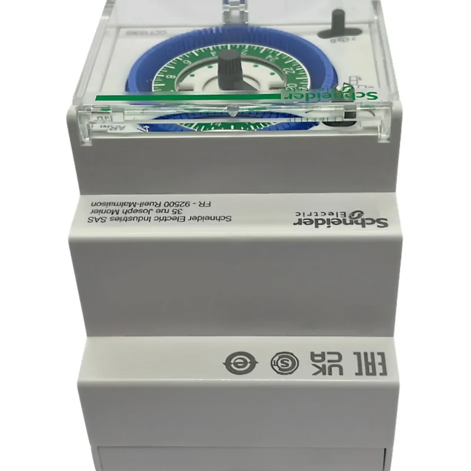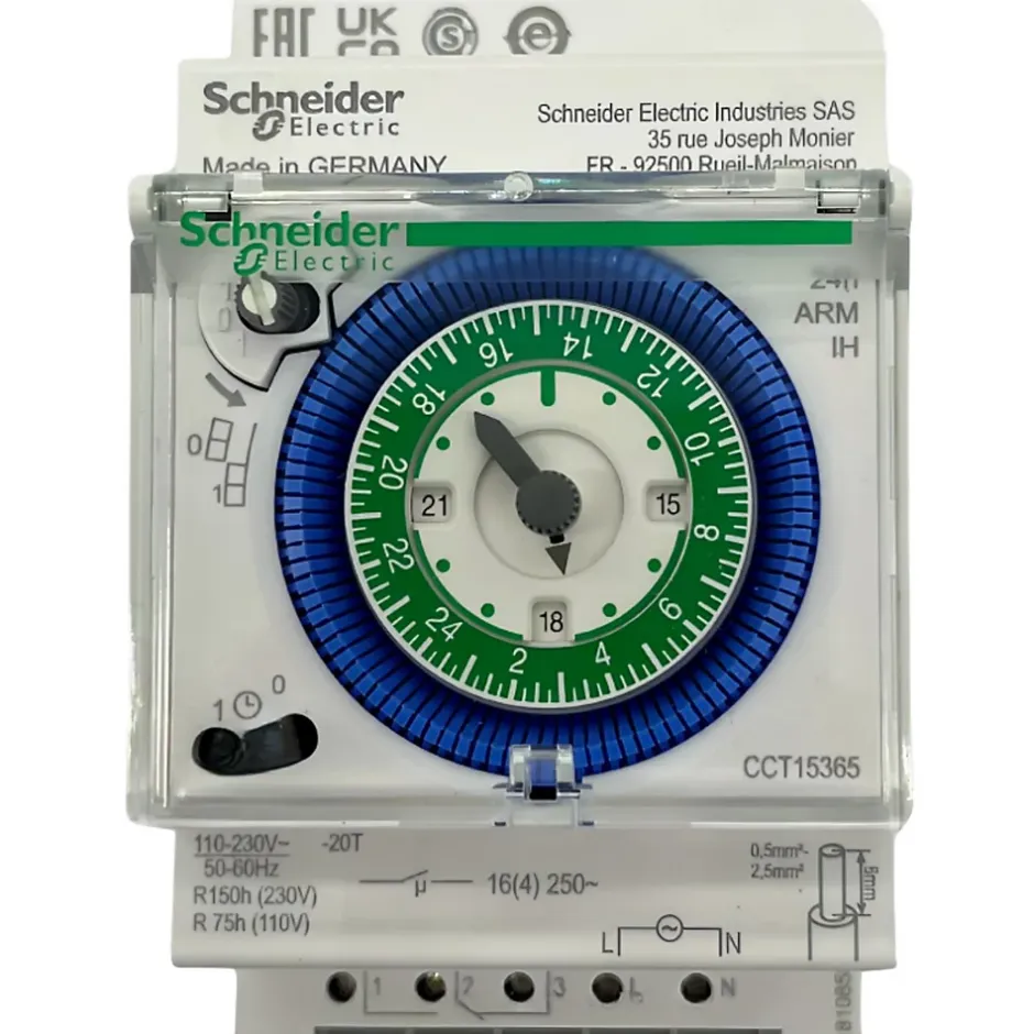 Interrupteur horaire journalier avec réserve de marche 150hCette horloge modulaire analogique appartient à la gamme Acti 9 IDH fabriquée par Schneider.Cet interrupteur modulaire permet de programmer le fonctionnement d’appareil sur une plage horaire de 24H.L’avantage de l’interrupteur horaire analogique CCT15365 est sa programmation simple et rapide.Il vous suffit d’exercer une pression sur les segments de commutation (ergots bleus) aux horaires ou vous souhaitez activer le programme. Le disque de réglage central indique la période de commutation.Chaque segment de commutation représente un intervalle de 15 minutes.Cet interrupteur programmable doit être installé sur un circuit de tension 230V et 16A. Nous vous conseillons de relayer l’horloge modulaire CCT15365 à un contacteur modulaire pour assurer la durée de vie des contacts.En cas de coupure de courant, cette horloge programmable analogique dispose d’une réserve de marche de 150h avec mémorisation du programme.Le cadran horaire est protégé par un capot pivotant plombable.