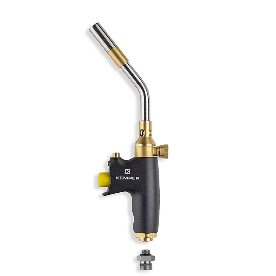 Le chalumeau à gaz professionnel KEMPER avec allumage piezo est conçu avec un design ergonomique, un corps en aluminium léger et robuste.Le chalumeau est fiable et facile à utiliser grâce à sa position inclinable à 360° sans risque de fuite. Conçu pour le soudobrasage (tendre et fort) et les soudures plomberies, ce chalumeau convient aussi bien aux professionnels qu’aux particuliers. Sa flamme peut être réglée en mode Turbo ou en flamme continue en fonction des travaux.Muni d’un adaptateur (20/150) et d’un tuyau de connexion directe à une bouteille de gaz, le chalumeau peut être alimenté par une cartouche de gaz (filetage M10) ou par une bouteille de gaz propane.Caractéristiques : – Chalumeau professionnel Propane.- Compatible avec les cartouches de gaz haute performance (mélange butane/propane) 250g- Filetage M10 (7/16″)- Equipé d’un adaptateur (20/150)- Alimentation : Fonctionne avec bouteilles de gaz Propane 13 kg (tuyau 2m inclus à brancher directement sur la bouteille de gaz)- Flamme réglable : jusqu’à 2400°C- Capacité de soudure : jusqu’à 950°C- Inclinable 360°- Puissance : 4.7 kw- Poids chalumeau : 320 g- Dimension chalumeau : 27.5 x 9.5 x 3 cm.