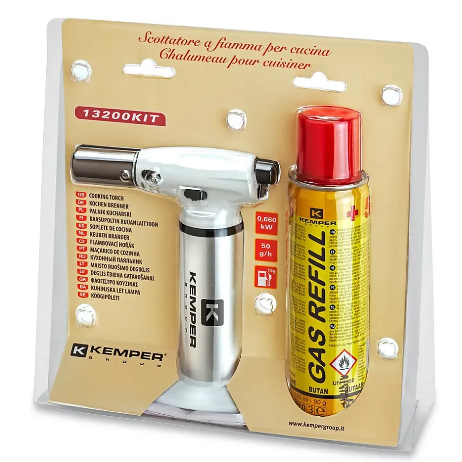 Élevez vos créations culinaires avec notre brûleur de cuisine haut de gamme, conçu pour les chefs amateurs et professionnels. Ce brûleur est équipé d’un allumage piézo intégré et d’un grand réservoir de 13g, offrant puissance, précision et sécurité.Points Forts :- Sécurité Enfant : Doté d’un verrouillage de sécurité spécialement conçu pour protéger les plus jeunes, ce brûleur vous assure une tranquillité d’esprit lors de son utilisation.- Bouton de Fonctionnement Continu : activez la flamme continue grâce à un bouton dédié, vous permettant de concentrer toute votre attention sur la préparation de vos plats.- Réglage de l’Intensité de la Flamme : Adaptez la flamme selon vos besoins spécifiques.- Fonction Flamme Douce : La régulation de l’air intégrée permet de générer une flamme douce et stable.- Recharge avec Cartouche de Gaz : Le chalumeau est livré avec une cartouche de gaz butane de 90g incluse.Avantages :- Précision et Polyvalence : La flamme réglable offre une grande précision, idéale pour les applications culinaires variées.- Légèreté et Durabilité : Conçu en aluminium, ce brûleur est à la fois léger et résistant, prêt à supporter une utilisation intensive.- Utilisation Facile : L’allumage piézoélectrique assure une mise en route simple et rapide à chaque utilisation.Utilisations Idéales :- Caramélisation des Gâteaux : Parfait pour créer une croûte sucrée et croustillante sur vos desserts.- Brunissage des Viandes : Offrez à vos viandes une finition dorée impeccable.- Fondre et Chauffer : Pratique pour faire fondre du fromage, du sucre, ou chauffer d’autres ingrédients délicats.Caractéristiques Techniques :- Puissance : 0.7 kW- Matériau : Aluminium- Allumage : Piézoélectrique – Flamme : Réglable- Régulation de l’air ajustable- Flexibilité : Fonctionne en toutes positions- Consommation : 50g/h- Type