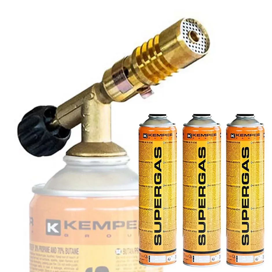 Kit de soudure à la flamme KEMPER avec buse en laiton + 3 cartouches de gaz 600ml 330gr Polyvalent : Bruleur à gaz idéal pour le soudage à la flamme , la brasure , le décapage de peinture Consommation : 114 g/h. Autonomie: 5 heures max à Puissance réglable. Prise d’air réglable pour obtenir une flamme douce. Température de la flamme : 650° à 1800°. Hauteur : 24 cm. Largeur : 12 cm. Poids total : 1600g.