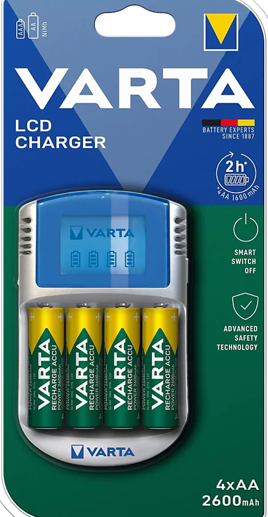 Avec le chargeur de piles universel Varta, chargez vos piles chez vous en toute tranquillité. La fonction de commande de la température permet d’arrêter la charge si la température atteint un certain niveau. Inclut une fonction d’arrêt automatique pour les piles non rechargeables, défectueuses, où pour lesquelles les bornes positives et négatives ont été inversées.