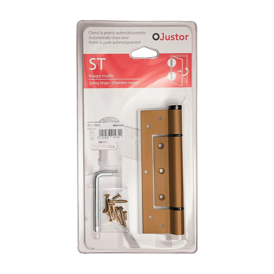 Charnière simple action à ressort posée totalement en applique, pour une installation la plus simple du marché, avec un corps très fin en aluminium et un large choix de finitions très résistante. Charnière simple action à ressort, 150X30 mm, en aluminium anodisé argent, pour porte de 30 mm d’épaisseur, ouverture maximale à 180 °, avec un dessin spécial, grâce auquel une aile s’emboîte dans l’autre, ce qui offre une épaisseur exceptionnellement fine (2,5 mm). Il n’est donc plus nécessaire, de réaliser une mortaise dans la porte ou le cadre, la paumelle rentrant dans le jeu standard de la porte Version a lame centréeForce de rappel ajustable au poids et dimensions de la porte, par réglage de la tension du bouchon en zamac. Rondelles de friction en polyamide, pour une grande souplesse en fonctionnement en silence. Ressort intérieur : paquet de lamelles acier au carbone avec graisse de protection, dans un tube en acier inox 304. Charge maximale admise, porte de largeur 100 cm poids 40 KG, avec 2 charnières. Charge maximale admise, porte de largeur 100 cm poids 60 KG, avec 3 charnières. Produit garanti 500 000 cycles. Fabriqué en Espagne. Utilisable en intérieur ou extérieur. Clef pour le réglage et vis fournis.