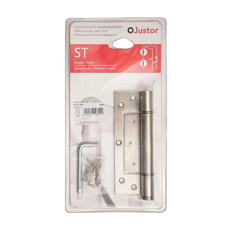 Charnière simple action à ressort posée totalement en applique, pour une installation la plus simple du marché, avec un corps très fin acier inoxsatiné trés résistant a la corrosion. Charnière simple action à ressort, 150X40 mm, en acier inox satiné, pour porte de 40 mm d’épaisseur, ouverture maximale à 180 °, avec un dessin spécial, grâce auquel une aile s’emboîte dans l’autre, ce qui offre une épaisseur exceptionnellement fine (2,5 mm). Il n’est donc plus nécessaire, de réaliser une mortaise dans la porte ou le cadre, la paumelle rentrant dans le jeu standard de la porte Force de rappel ajustable au poids et dimensions de la porte, par réglage de la tension du bouchon en zamac. Rondelles de friction en polyamide, pour une grande souplesse en fonctionnement en silence. Ressort intérieur : paquet de lamelles acier au carbone avec graisse de protection, dans un tube en acier inox 304. Charge maximale admise, porte de largeur 100 cm poids 40 KG, avec 2 charnières. Charge maximale admise, porte de largeur 100 cm poids 60 KG, avec 3 charnières. Produit garanti 500 000 cycles. Fabriqué en Espagne. Utilisable en intérieur ou extérieur. Clef pour le réglage et vis fournis.