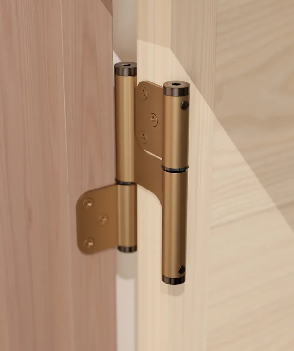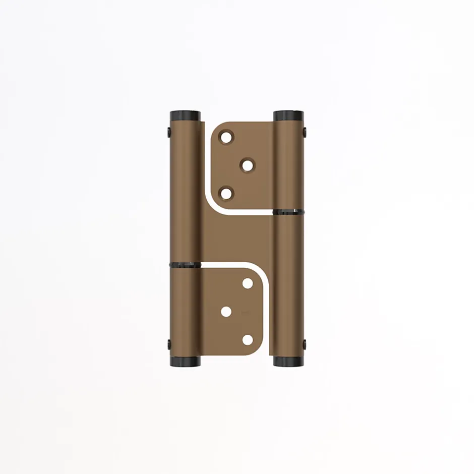 Charnière va et vient, à ressort, posée totalement en applique, pour une installation la plus simple du marché, avec un corps très fin en aluminium et un large choix de finitions très résistante. Charnière double action, va et vient à ressort, 120X35 mm, en aluminium anodisé bronze, pour porte de 40 mm d’épaisseur, ouverture maximale à 180 °, avec un dessin spécial, grâce auquel une aile s’emboîte dans l’autre, ce qui offre une épaisseur exceptionnellement fine (2,5 mm). Il n’est donc plus nécessaire, de réaliser une mortaise dans la porte ou le cadre, la paumelle rentrant dans le jeu standard de la porte Force de rappel ajustable au poids et dimensions de la porte, par réglage de la tension du bouchon en zamac. Rondelles de friction en polyamide, pour une grande souplesse en fonctionnement en silence. Ressort intérieur : paquet de lamelles acier au carbone avec graisse de protection, dans un tube en acier inox 304. Charge maximale admise, porte de largeur 100 cm poids 13 KG, avec 2 charnières. Charge maximale admise, porte de largeur 100 cm poids 25 KG, avec 3 charnières. Produit garanti 250 000 cycles. Fabriqué en Espagne. Utilisable en intérieur ou extérieur. Clef pour le réglage et vis fournis.