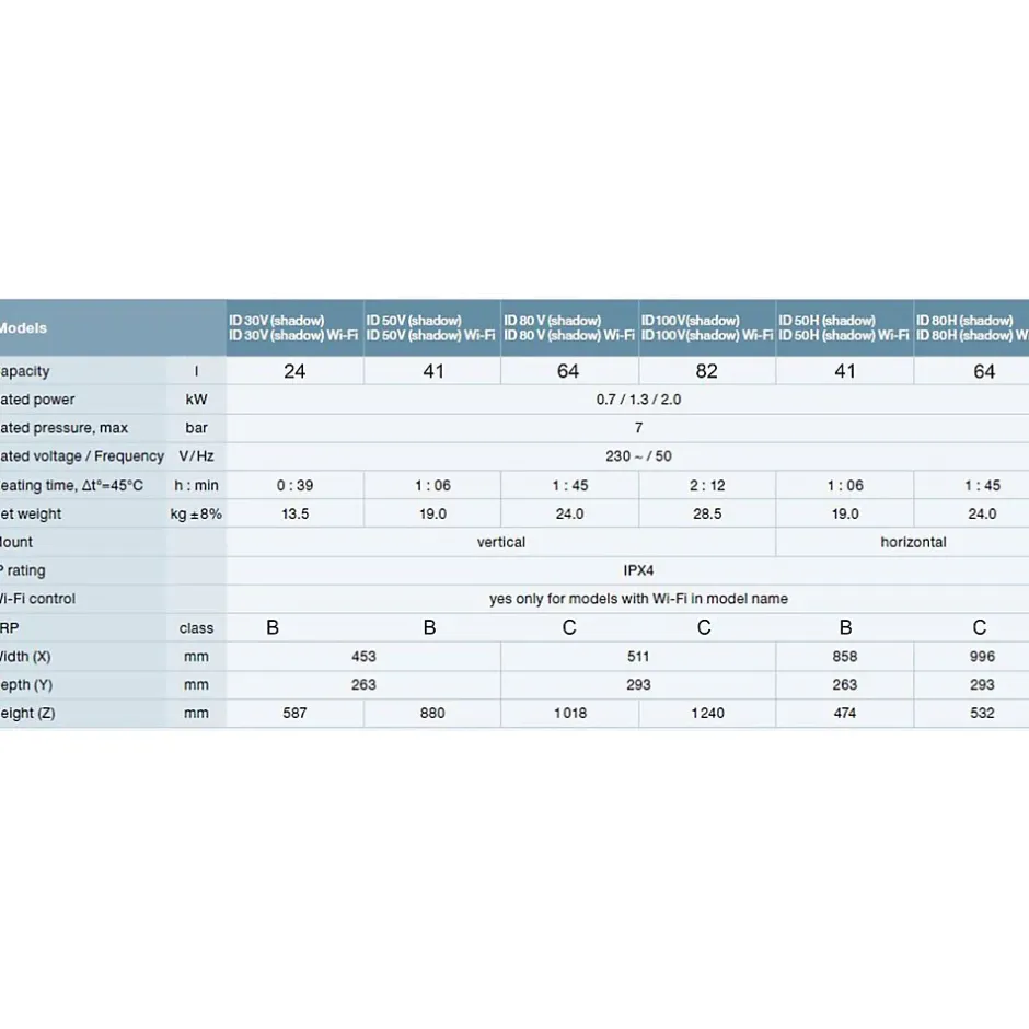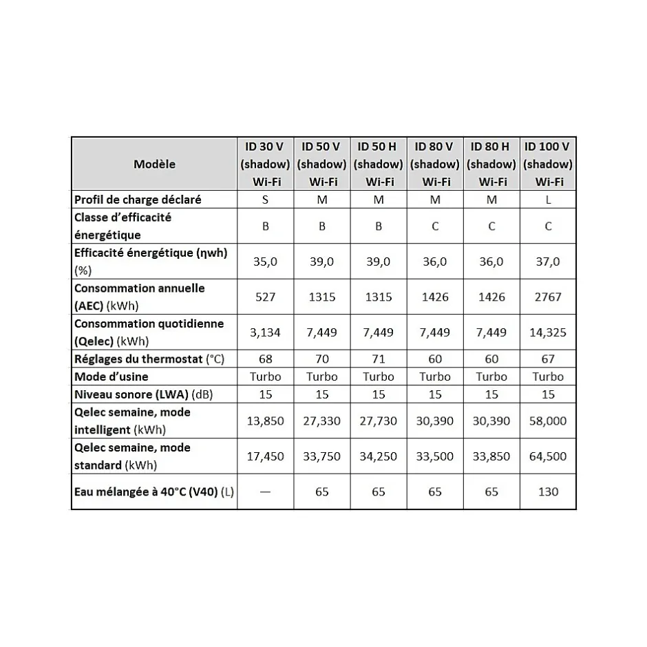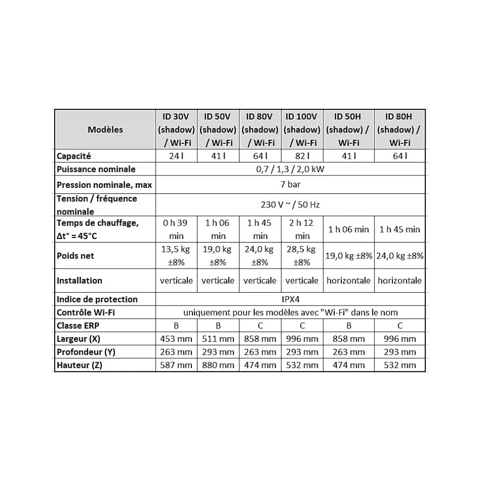 Chauffe-eau Thermex ID Shadow Wi-FiContrôle Wi-Fi via l’application Thermex Home !Le mode intelligent SMART analyse les habitudes de l’utilisateur et ajuste le chauffage de l’eau selon un cycle de 7 jours.Lorsque l’eau chaude n’est pas nécessaire, l’appareil maintient la température au minimum — un confort maximal avec une consommation réduite !? Nouveau designLe boîtier sombre, minimaliste et élégant s’intègre parfaitement dans un intérieur moderne et s’accorde avec toutes les palettes de couleurs.? Gain d’espaceGrâce à la technologie à double réservoir Double Tank, le chauffe-eau est plat et compact — il s’adapte facilement même dans un petit appartement.? Haute efficacité énergétiqueClasse B : modèles de 30 et 50 litresClasse C : modèles de 80 et 100 litresEfficacité maximale et économies d’énergie !? Gestion intelligentePanneau de commande tactile avec affichage de la température, des modes de fonctionnement et des messages d’erreur.Fonction d’autodiagnostic et protection contre le gel incluses.? Protection fiableLe réservoir interne avec revêtement BIO-glasslined est résistant à la corrosion et aux variations de température — une longue durée de vie sans soucis.Caractéristiques techniques :Type : accumulateur, électriquePuissance : 2,0 kW (trois modes : 0,7 / 1,3 / 2,0 kW)Capacité :ID 30 V — 25 LID 50 V / H — 42 LID 80 V / H — 67 LID 100 V — 84 LPression maximale : 7 barsTension / Fréquence : 230 V / 50 HzTemps de chauffage (Δt 45°C) :ID 30 — 0 h 39 minID 50 — 1 h 06 minID 80 — 1 h 45 minID 100 — 2 h 12 minMontage :Modèles V — verticalModèles H — horizontalIndice de protection : IPX4Dimensions (L x P x H) :ID 30 V — 453 x 263 x 587 mmID 50 V — 453 x 263 x 880 mmID 80 V — 511 x 293 x 1018 mmID 100 V — 511 x 293 x 1240 mmID 50 H — 858 x 263 x 474 mmID 80 H — 996 x 293 x 532 mmInclus : soupape de sécurité, câble d’alimentation