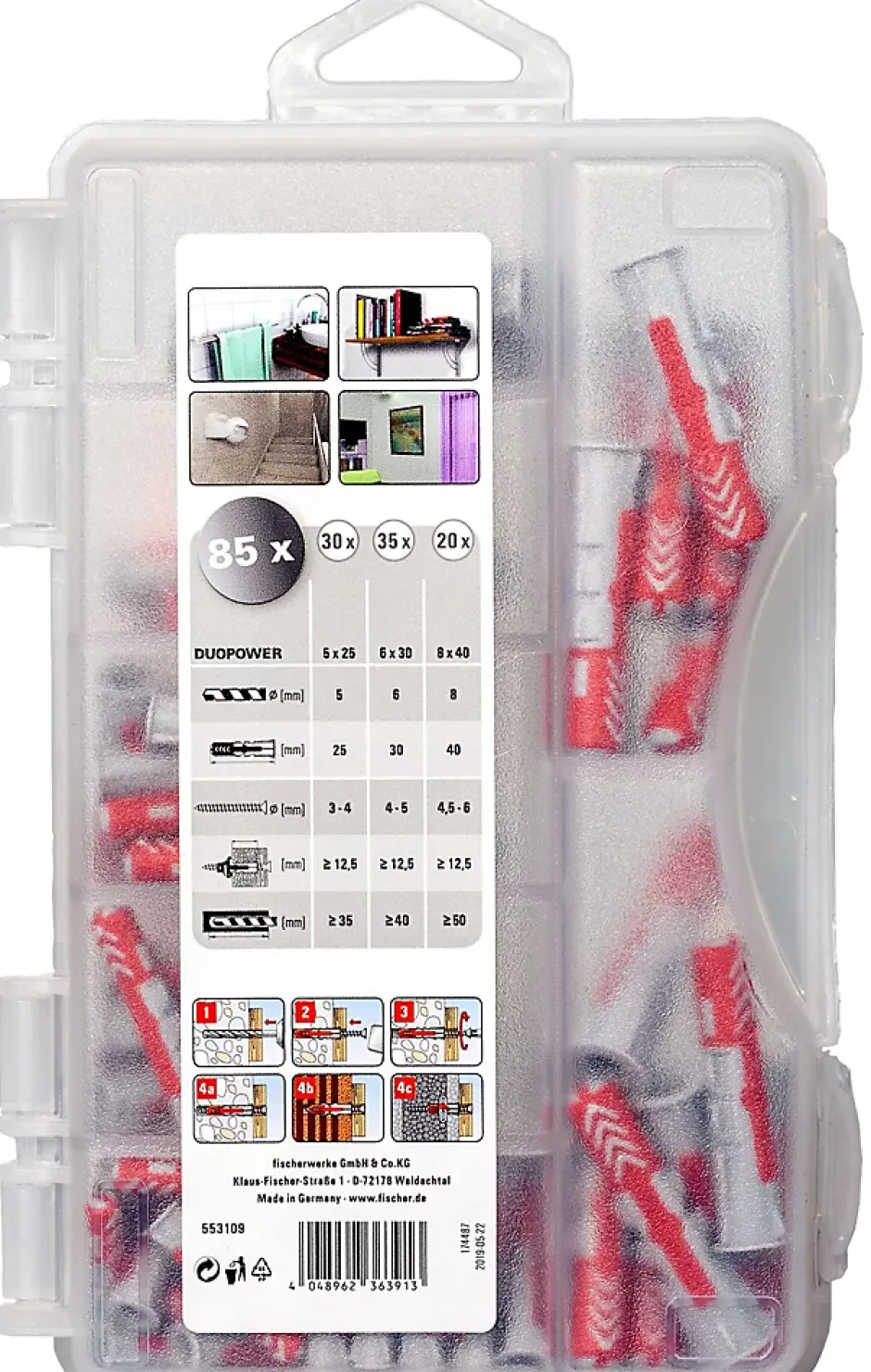 La fischer DuoPower-Box mini contient 30 DuoPower 5 x 25, 35 DuoPower 6 x 30 et 20 DuoPower 8 x 40 compartimentés. La Minibox, fabriquée en plastique de haute qualité et résistant aux chocs, offre un rapport qualité/prix optimal. Pratique, la boîte contient un assortiment sélectionné de chevilles pour les applications et les matériaux de construction les plus fréquents. Grâce au couvercle transparent et aux compartiments, le contenu peut être visualisé en un coup d’œil. Cela permet de gagner du temps et garantit la sélection de l’élément de fixation approprié. La MiniBox se ferme en toute sécurité et peut être rechargée.
