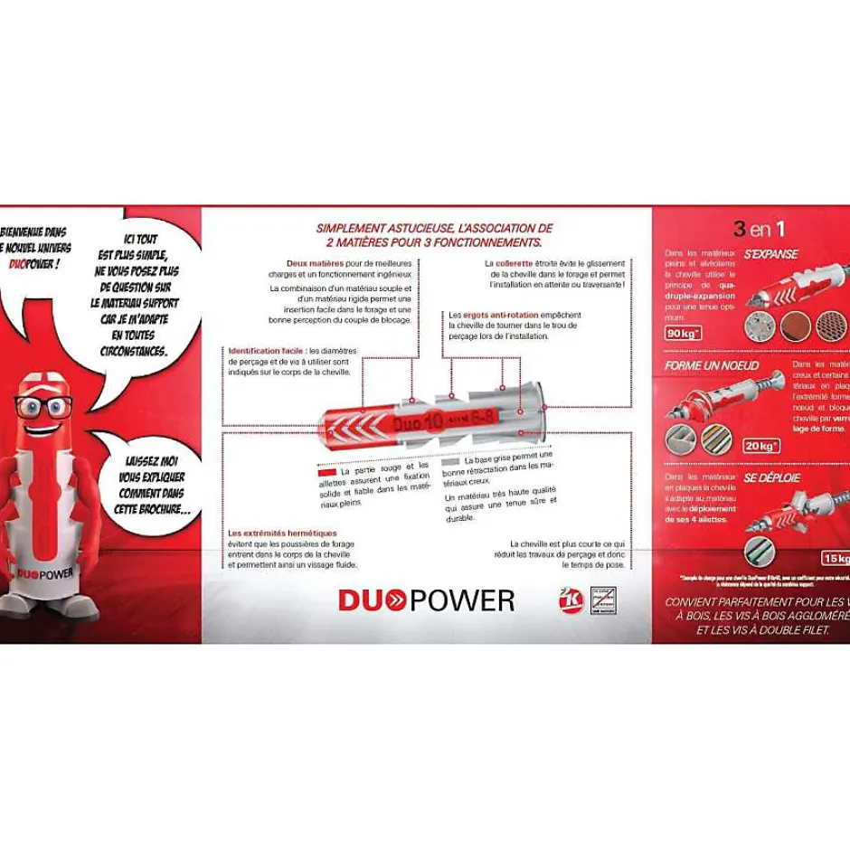 La DUOPOWER convient pour le montage en attente et le montage traversant. L’alliance des deux matières et les modes de fonctionnement multiples (se déploie, s’expanse, forme un noeud) élargissent le champ d’applications avec des charges significativement plus élevées. La longueur requise de la vis se détermine comme suit : longueur de la cheville + épaisseur à fixer + diamètre de la vis. Convient pour les vis à bois, les vis à bois aggloméré et les vis à double filet. Pour les matériaux en plaques et les matériaux creux, la partie lisse de la vis ne doit pas être supérieure à l’épaisseur à fixer. La distance aux bords doit être au moins égale.