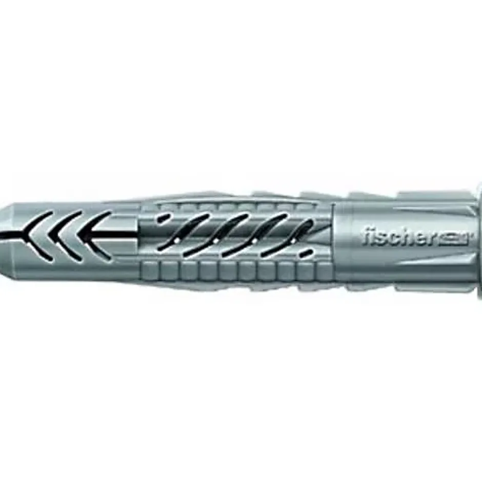 Chevilles universelles en nylon Fischer, diamètre 8 mm, longueur 50 mm, conditionné par 50 pièces. Conçues pour une utilisation dans matériaux pleins (béton, brique) et matériaux creux ou plaques (carton-plâtre), la tenue est assurée par l’expansion de la cheville contre les parois du forage et, dans les matériaux creux, par un verrouillage de forme. Matière : nylon. Perçage recommandé : foret 8 mm. Modèle : Fischer 62762.