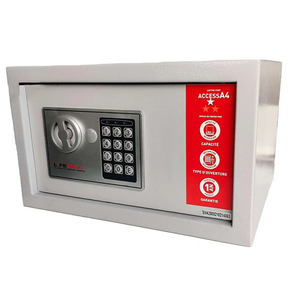 Coffre-fort 14 litres ouverture par digicodeCoffre-fort de 14 litres pour bijoux à ouverture par digicode et avec clés de secours. Permet de protéger ses biens de valeur bijoux, chéquier, devises, portefeuille, passeport….Niveau de protection : 1- InitialType d’ouverture : DigicodeClés de secours : OuiPiles pour ouverture électronique fournies : OuiDimensions extérieures (largeur x hauteur x profondeur) : 33 x 20 x 28 cmDimensions intérieures (largeur x hauteur x profondeur) : 32,6 x 19,6 x 27,6 cmCapacité 14 LPoids : 4,2 KgMatériaux utilisés : AcierEpaisseur de la paroi : 1 mmEpaisseur de la porte : 2 mmNombre de pênes : 2Coffre à fixer : OuiType de fixation : Au sol ou muralKit de fixation : InclusEcran digital : NonFermeture motorisée : NonEclairage intérieur : NonPrise électrique intérieure : NonAnti-enfoncement : NonIgnifuge : NonValeurs assurables : NonCertification : Non Garantie : 1 + 1 an