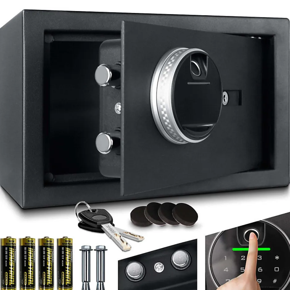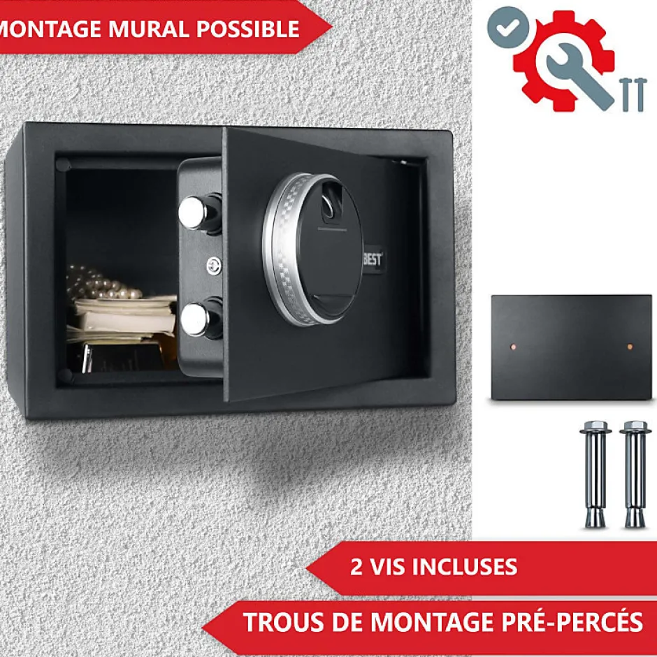 Coffre-fort pour meublesLe coffre-fort électronique pour meubles offre le plus haut niveau de protection pour vos objets de valeur. Le coffre-fort peut être facilement déverrouillé avec une empreinte digitale ou un code numérique. De plus, 2 clés d’urgence sont incluses avec lesquelles vous pouvez également ouvrir le coffre-fort manuellement. Après le déverrouillage, la porte du coffre-fort peut être facilement ouverte à l’aide du bouton rotatif au fonctionnement fluide.Dimensions:Taille M – 31 x 20 x 20 cm (L x H x P)Intérieur spacieux avec tapis en feutre pour protéger contre les rayuresFonctionnalités de sécurité-Stockage jusqu’à 99 empreintes digitales-Code numérique de 4 à 8 chiffres-2 clés de secours pour ouverture manuelle-Porte en acier massif (4 mm d’épaisseur) avec 2 ou 3 pênes de verrouillage solides-Élément de commande LCD numérique avec signal acoustiqueFonctionne sur piles-Fonctionne avec 4 piles AA-Jusqu’à 700 utilisations par batterieFacile à manipuler et à assembler-Bouton à fonctionnement fluide pour ouvrir la porte-Éclairage intérieur pour une meilleure vue d’ensemble-Matériel de pré-perçage et de montage pour montage mural ou dans une armoire-Quatre pieds antidérapants pour un maintien sûrHaute qualité-Acier massif pour une protection optimale- Fonctions de sécurité faciles à utiliser et fiables- Intérieur avec tapis en feutre pour protéger les objets de valeurSupport client et SAV en Français – Pas de livraison dans le DOM TOM et la Corse.