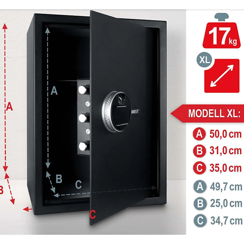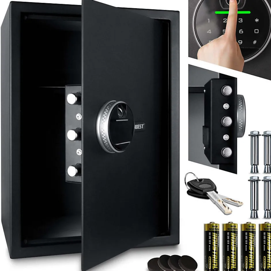 Coffre-fort pour meublesLe coffre-fort électronique pour meubles offre le plus haut niveau de protection pour vos objets de valeur. Le coffre-fort peut être facilement déverrouillé avec une empreinte digitale ou un code numérique. De plus, 2 clés d’urgence sont incluses avec lesquelles vous pouvez également ouvrir le coffre-fort manuellement. Après le déverrouillage, la porte du coffre-fort peut être facilement ouverte à l’aide du bouton rotatif au fonctionnement fluide.Dimensions:Taille XL – 35 x 50 x 31 cm (L x H x P)Intérieur spacieux avec tapis en feutre pour protéger contre les rayuresFonctionnalités de sécurité-Stockage jusqu’à 99 empreintes digitales-Code numérique de 4 à 8 chiffres-2 clés de secours pour ouverture manuelle-Porte en acier massif (4 mm d’épaisseur) avec 2 ou 3 pênes de verrouillage solides-Élément de commande LCD numérique avec signal acoustiqueFonctionne sur piles-Fonctionne avec 4 piles AA-Jusqu’à 700 utilisations par batterieFacile à manipuler et à assembler-Bouton à fonctionnement fluide pour ouvrir la porte-Éclairage intérieur pour une meilleure vue d’ensemble-Matériel de pré-perçage et de montage pour montage mural ou dans une armoire-Quatre pieds antidérapants pour un maintien sûrHaute qualité-Acier massif pour une protection optimale- Fonctions de sécurité faciles à utiliser et fiables- Intérieur avec tapis en feutre pour protéger les objets de valeurSupport client et SAV en Français – Pas de livraison dans le DOM TOM et la Corse.