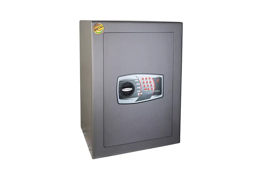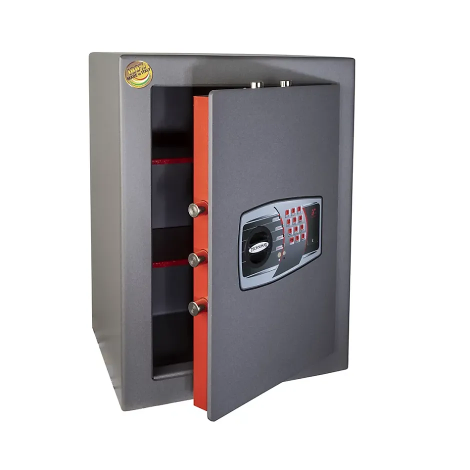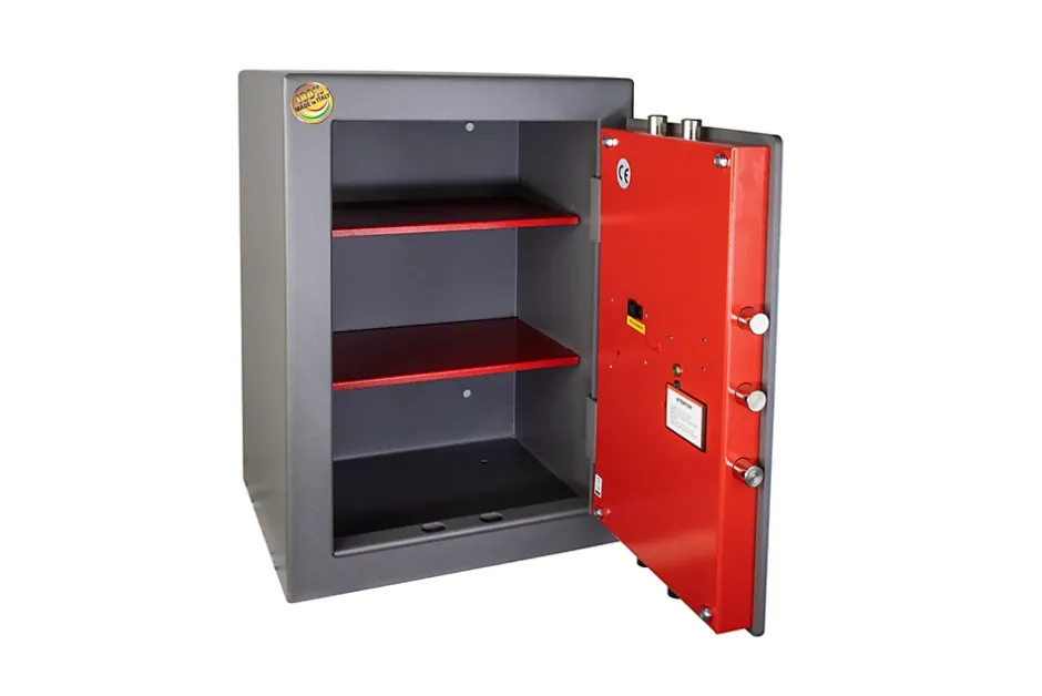 Cadre et porte épaisseur 8 mm.Corps épaisseur 4 mm.Serrure à combinaison électronique digitale certifiée EN 1300 contrôlée par un système électronique à mémoire permanente.Commande d’ouverture/fermeture et clavier à commande affleuranteAlimentation interne avec 4 piles alcalines de 1.5 V AA (non fournies).Alimentation de secours par contact extérieur sur le clavier.Secours par clé d’urgence à double panneton haute sécurité EVO-LOCK avec carte de propriété (2 clés fournies).Signalisation sonore et visuelle pour confirmation des codes, indication d’erreurs et charge insuffisante (Buzzer et Leds).7 pênes tournants anti-sciage en acier nickelé Ø 22 mm.Protection avec plaque d’acier au manganèse au niveau de la serrure et des pênes horizontaux et verticaux.Profil intérieur spécial offrant une résistance plus longue à l’enfoncement de la porte.Soudures internes réalisées par un système robotisé. Soudure périmétrique continue cadre/corps.2 tablettes intérieures amovibles.Trous de fixation au dos et à la base (4+4).Chevilles fournies.Peinture époxy au four.Dimensions intérieures : H 59 x L 42 x P 35 cmDimensions porte : H 51 x L 33 cmFabriqué en Italie.