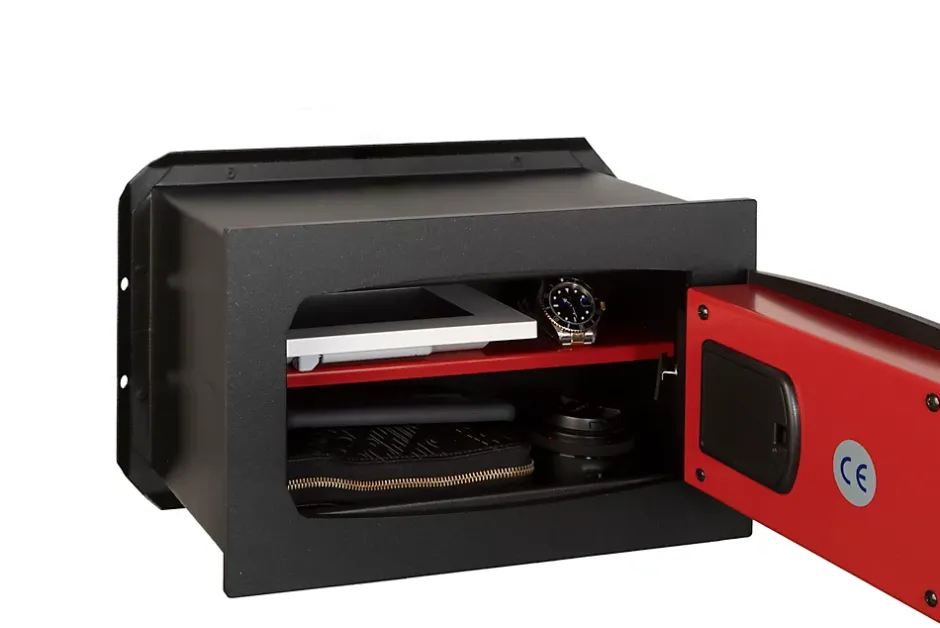 Serrure motorisée contrôlée par un système électronique à mémoire non volatile.Alimentation interne avec 4 piles de 1.5V AA. (non fournies).Alimentation de secours par contact extérieur sur le clavier.Secours par clé d’urgence (2 clés fournies).2 pênes horizontaux en acier nickelé Ø 18 mm.Ailettes d’ancrage anti-arrachement à l’arrière du coffre. Rajouter 6 cm en hauteur et 6 cm en largeur aux dimensions extérieures du coffre.Tablette intérieure amovible.Peinture époxy au four.Dimensions intérieures : H 18.5 x L 31.5 x P 14.5 cm
