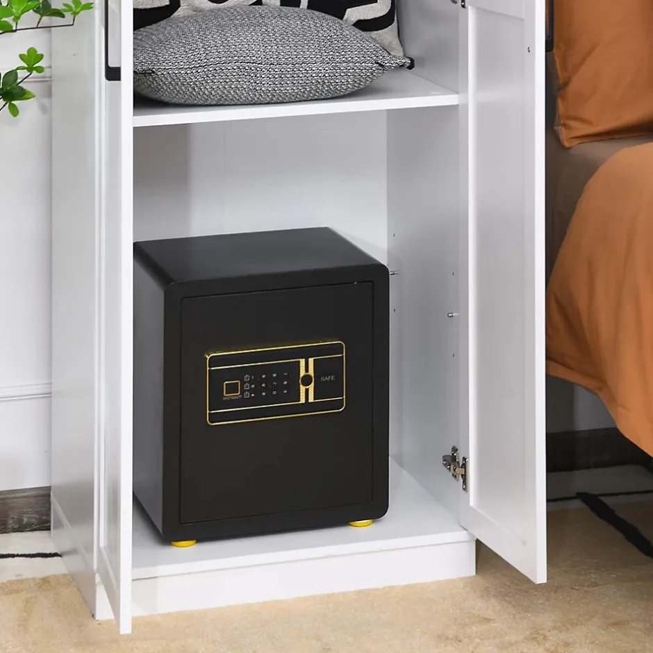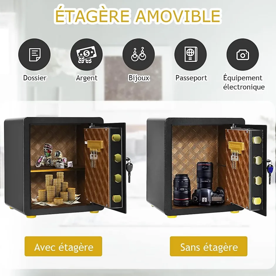 - Espace vaste et flexible : La taille intérieure est de 34 x 30 x24 cm, ce qui offre un grand espace pour stocker toutes sortes d’objets de valeur, tels que de l’argent, les bijoux, les documents juridiques, etc. L’étagère centrale est amovible pour s’adapter à différentes hauteurs d’articles. De plus, il y a des crochets pour les clés derrière les portes.