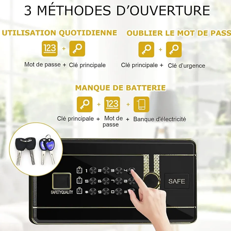 - 2 méthodes de déverrouillage : Il y a 2 méthodes d’ouverture, code numérique ou clés. Vous pouvez programmer un code de 3 à 8 chiffres comme votre propre mot de passe. En outre, le coffre-fort est livré avec deux clés d’urgence au cas où vous oublieriez votre mot de passe ou que la batterie est faible.