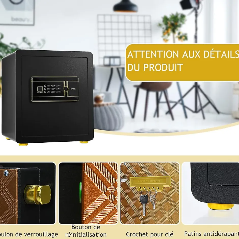 - Stockage très sécurisé : Ce coffre-fort qui est fabriqué à partir d’acier de construction au carbone robuste avec une porte en acier résistant à l’usure d’environ 5 cm d’épaisseur, peut résister à tous types d’assauts et de dégradations. De plus, le coffre-fort comporte 3 boulons de verrouillage en acier, qui ont la capacité de résister aux chocs et aux leviers.